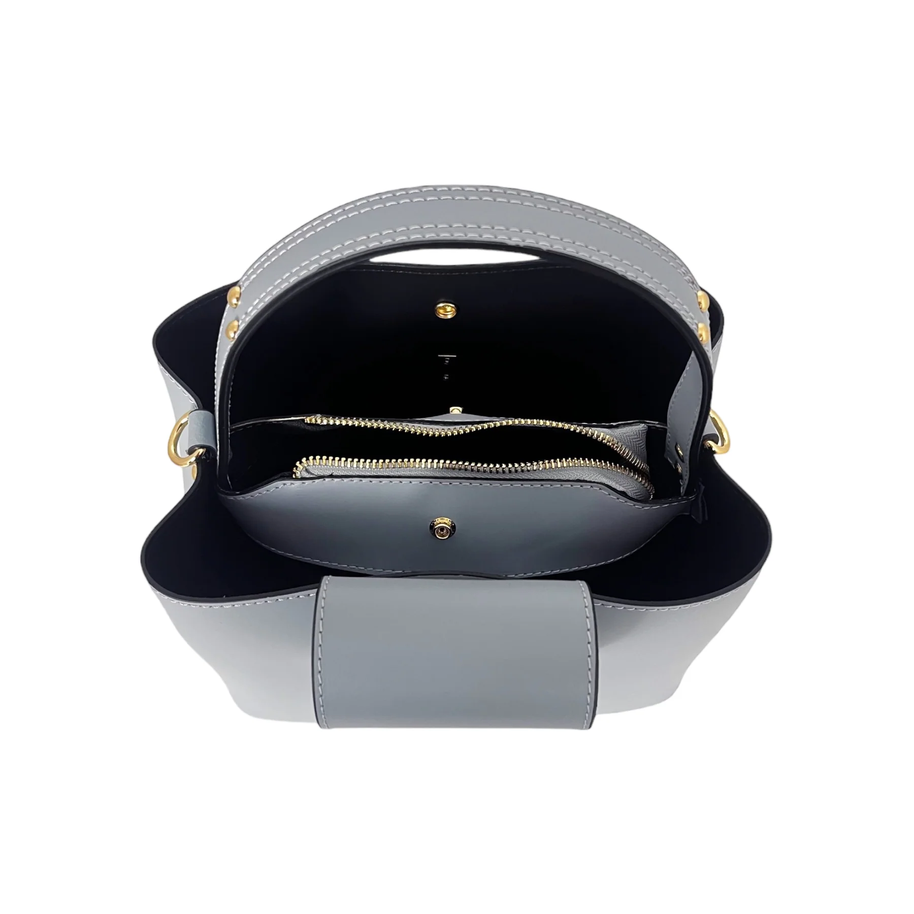 โข Possibilitร di allargare e stringere la borsa da due bottoni interni