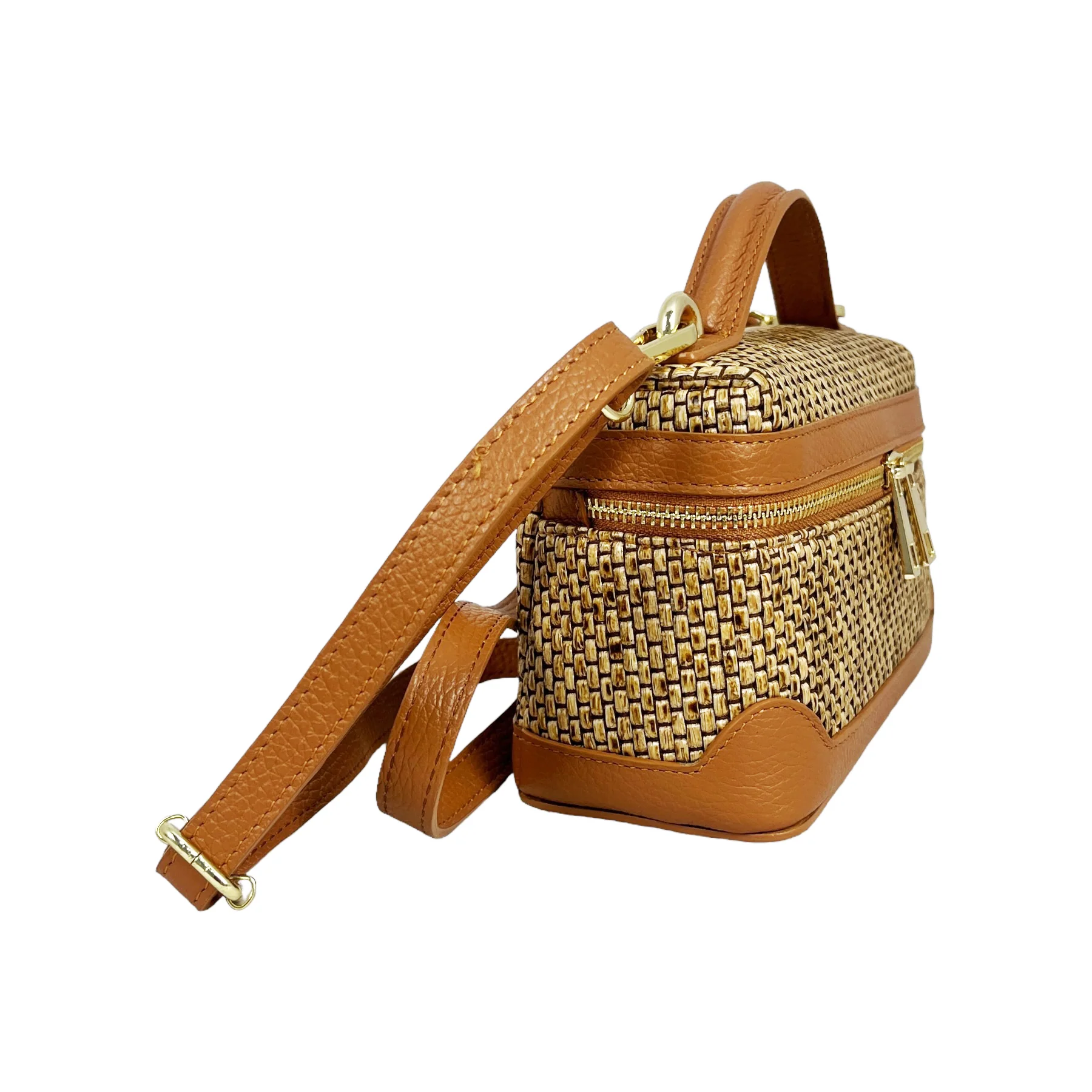 โ€ข 100% pelle Made in Italy e Rafia โ€ข Dimensioni: 21 cm x 13 cm x 8 cm (larghezza, altezza, profonditร ) โ€ข Tracolla regolabile in pelle DESCRIZIONE INTERNO โ€ข Scomparto centrale con chiusura a zip โ€ข Interno in poliestere
