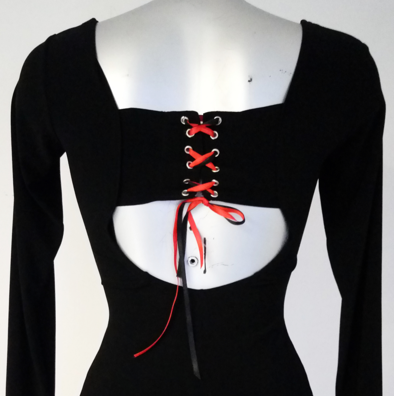 Particolaritร dell’abito รจ la scollatura sulla schiena, non troppo profonda, con una fascia che la divide a metร che si chiude anch’essa con un intreccio di nastri in raso bicolore, rosso e nero.