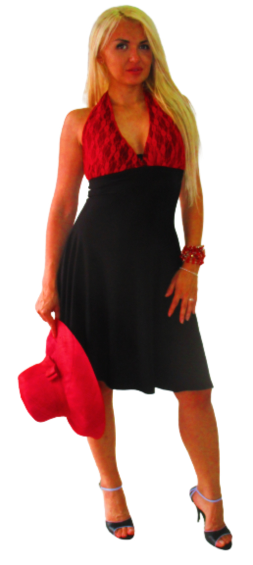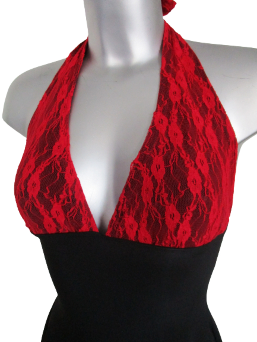 Abito perfetto per il tango, una serata fuori o per la vostra collezione estiva. Coppe Marilyn arricciate sotto doppiate in pizzo con colore in contrasto della viscosa, da legare al collo. Le spalle sono scoperte. L’abito rimanere aderente sotto al seno per poi aprirsi in una svasatura dal taglio asimmetrico. Il bordo รจ cucito in roulรจ. Disponibile nei colori nero o rosso con le coppe in contrasto. Potete scegliere anche senza la doppiatura in pizzo e con disponibilitร di piรน colori. Taglie dalla XS alla XXL.