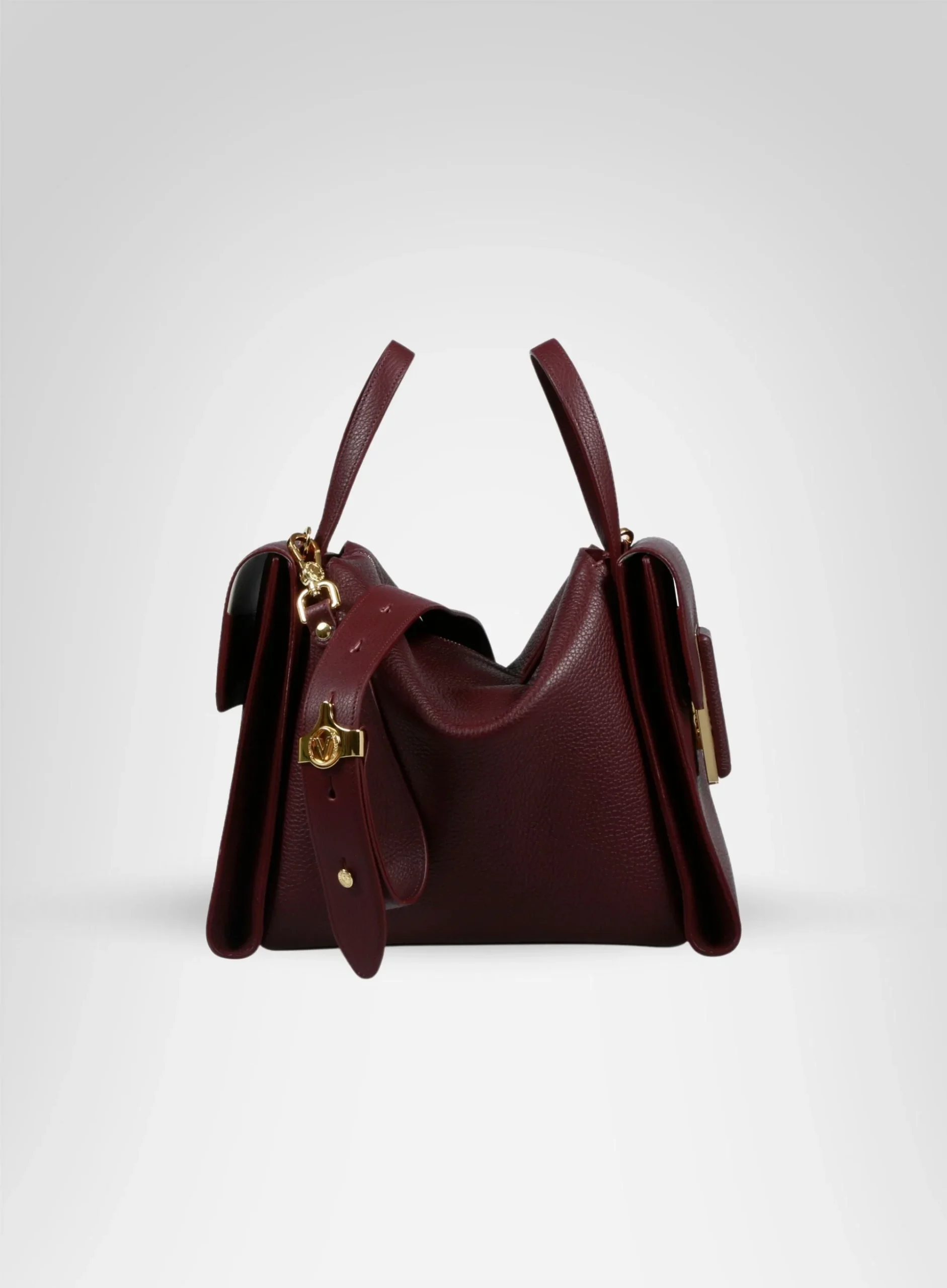Mini bag in pelle a grana dalle tonalità bordeaux. Design innovativo e comodità per uno stile unico.