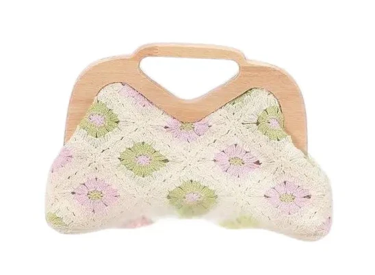 Borsa artigianale in crochet con dettagli in legno e motivi floreali. Disponibile in diversi colori: nero, beige, rosa-verde, verde, albicocca. Dimensioni: 29x8x20 cm. Perfetta per un look unico!
