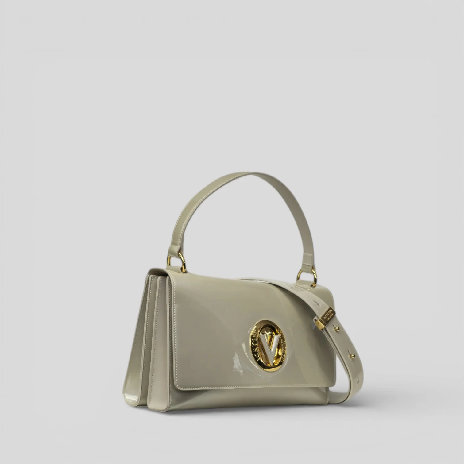 Lineare e pulita la borsa a mano in vernice oceano con maxi logo centrale in ottone specchiato