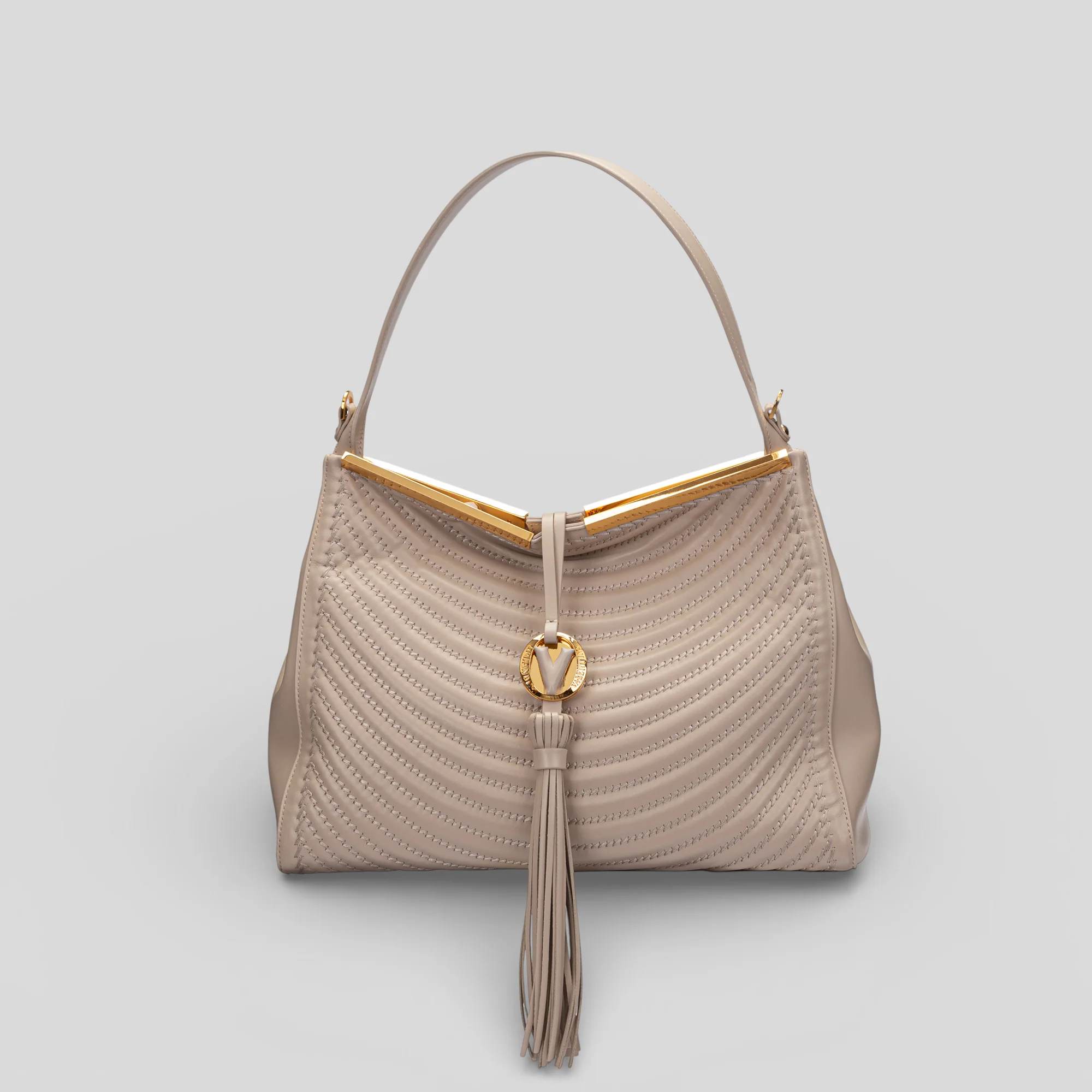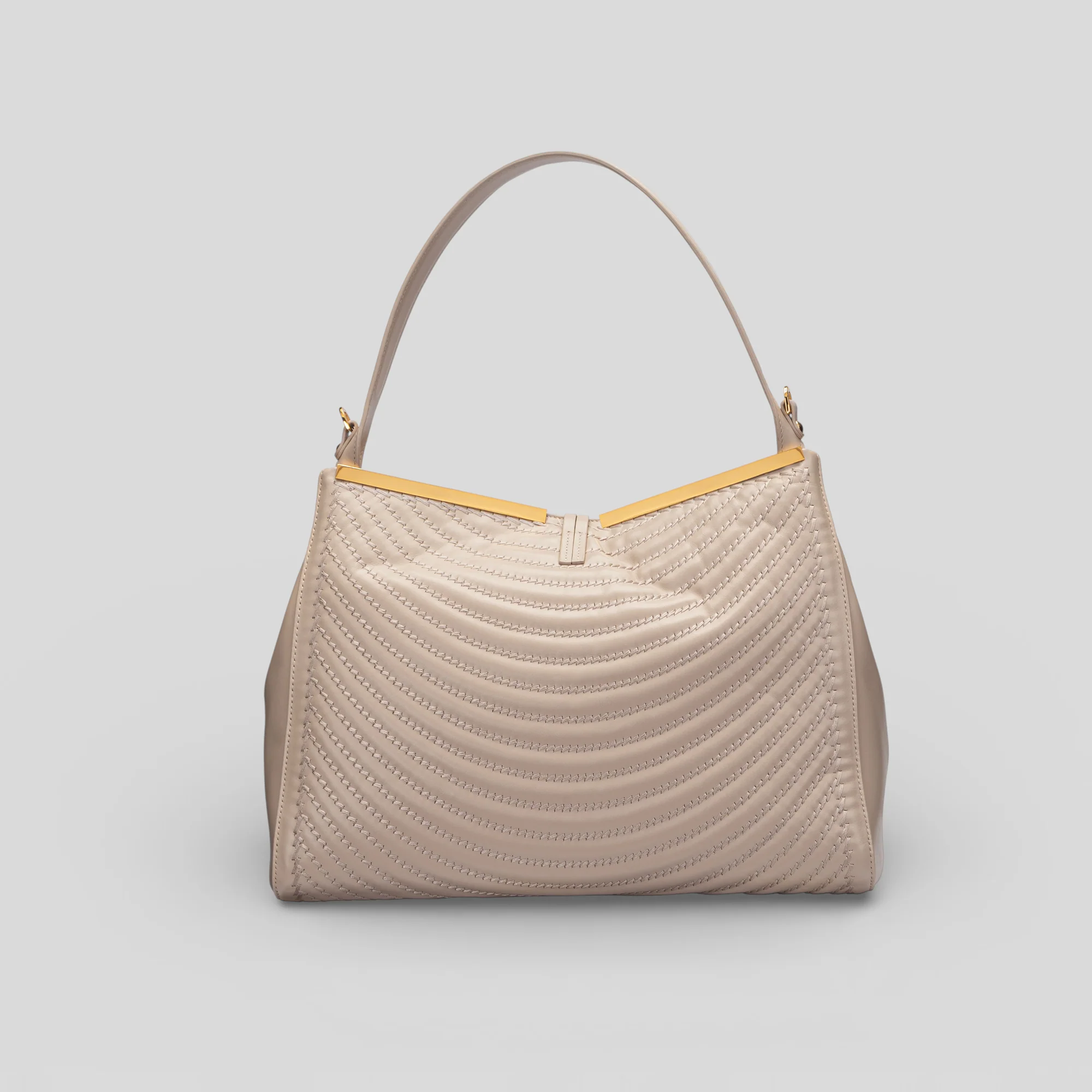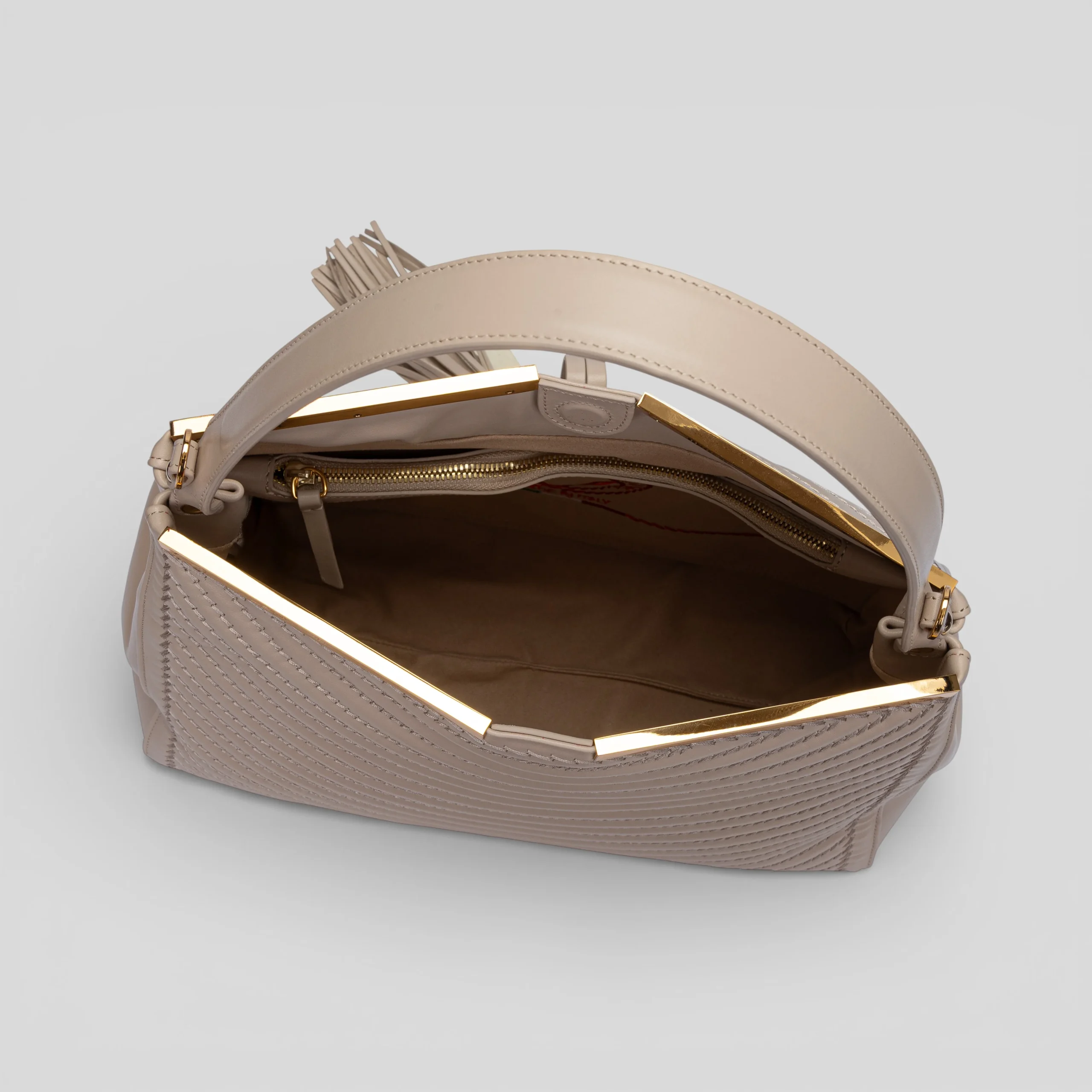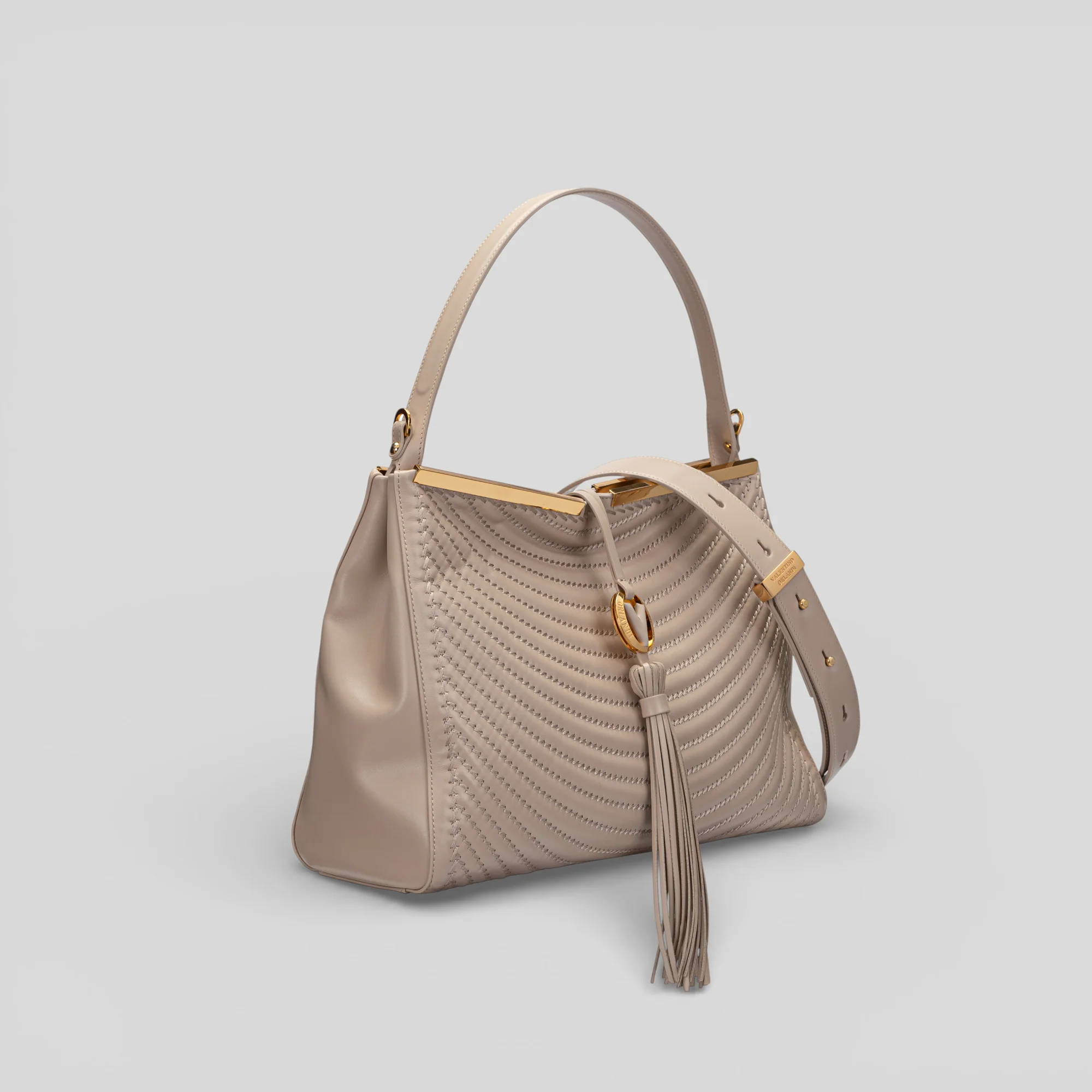 Borsa a mano con lavorazione RAGGI realizzata in vitello beige. Un accessorio immancabile nel guardaroba femminile.