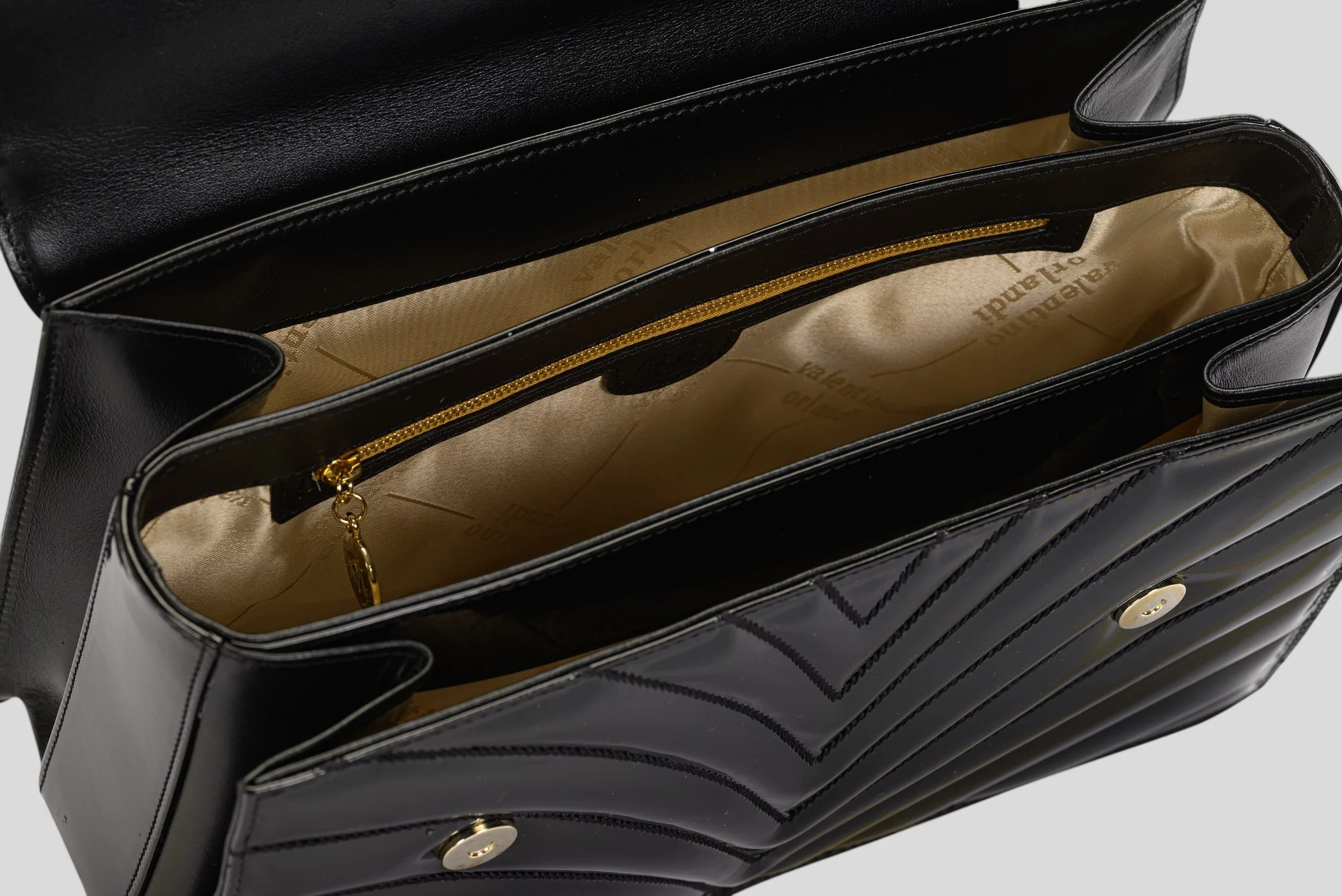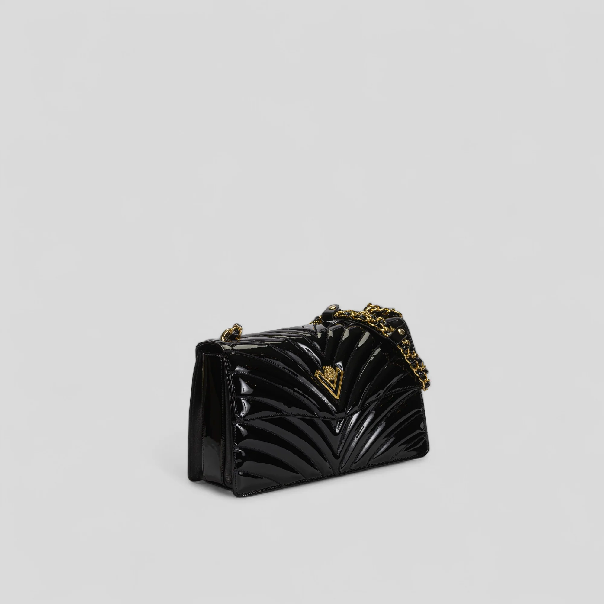 Tracolla realizzata in vernice caratterizzata dal motivo a spiga in rilievo.. Un must evergreen che sposa al meglio i trend moda con la massima qualità .