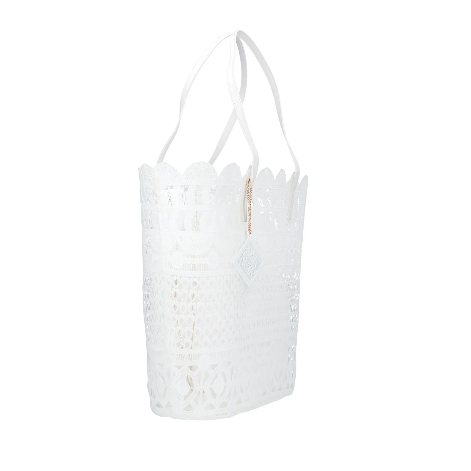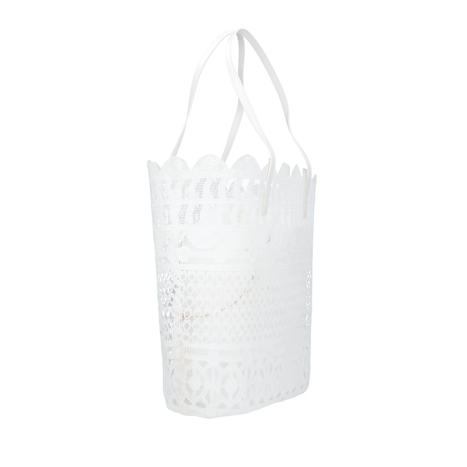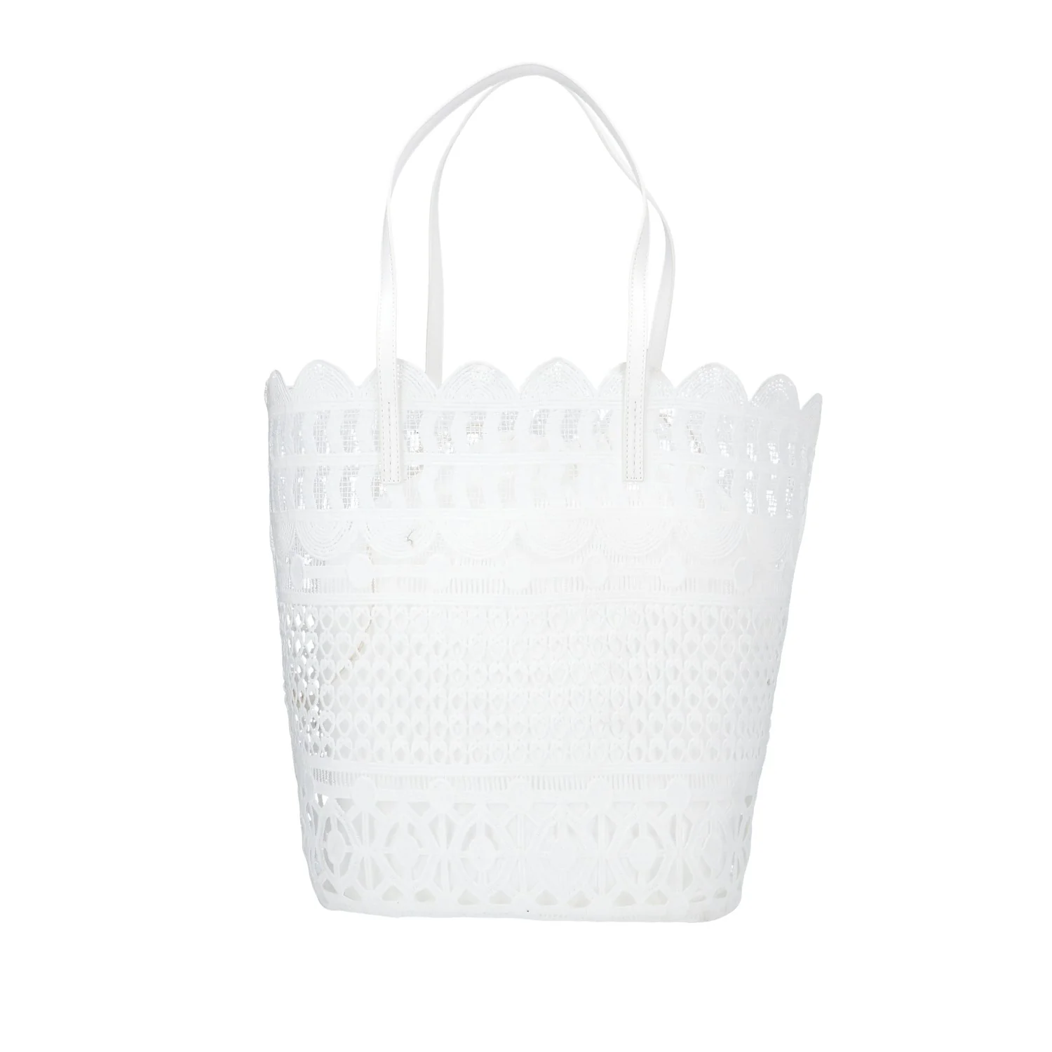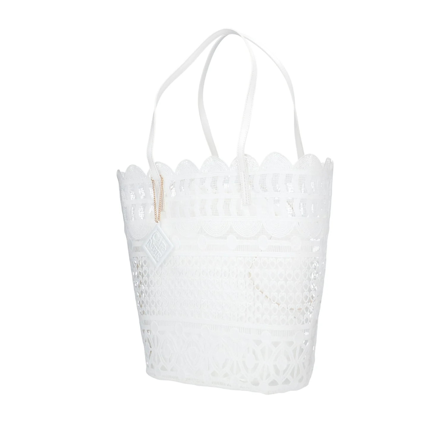 Modello: shopping; Materiale: pizzo; Colore: bianco; Interno: sacca in tessuto; Dettagli: charm logato; Chiusura: no; Dimensioni: 29/49x33x13 cm; Art.:VD0601