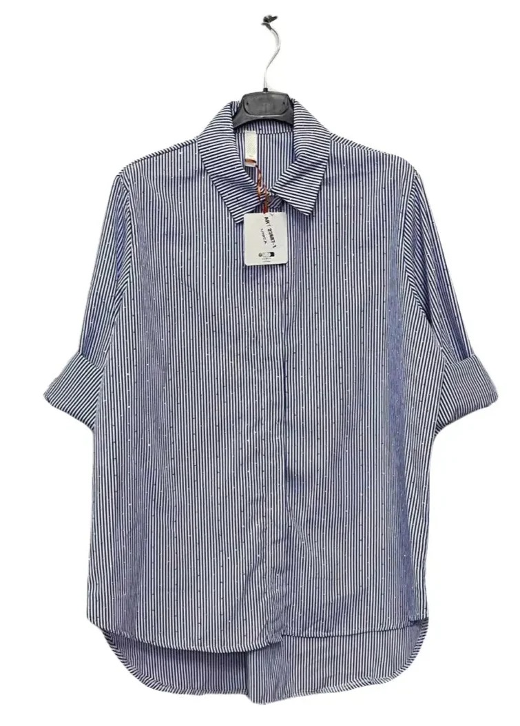 Il corpo principale รจ decorato con strisce verticali blu e bianche, con piccoli diamanti scintillanti sparsi tra le strisce per aggiungere un tocco di dettaglio. Il taglio รจ ampio e rilassato, con maniche lunghe che possono essere arrotolate e un classico colletto a camicia. Il design irregolare dell’orlo aggiunge un tocco di moda. Lo stile […]