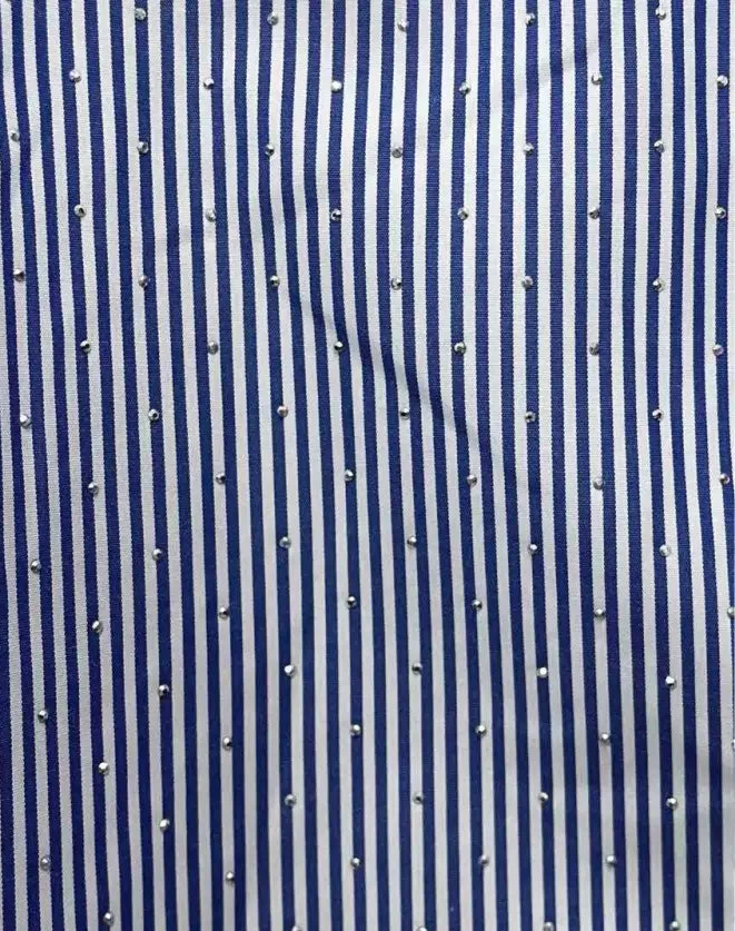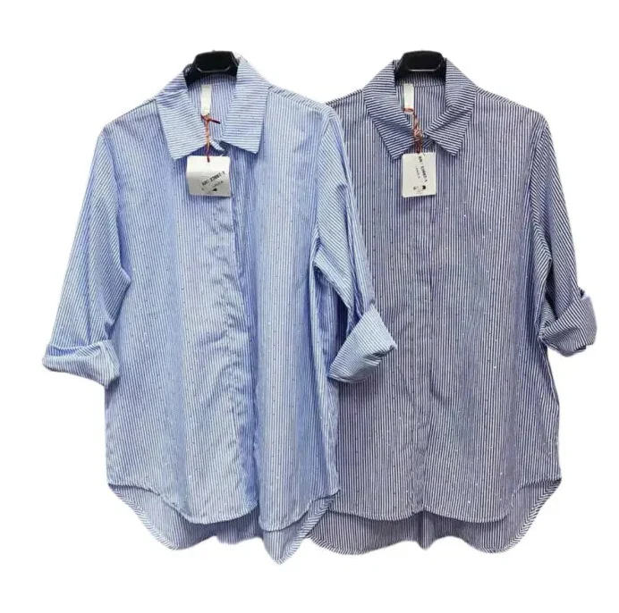 Il corpo principale รจ decorato con strisce verticali blu e bianche, con piccoli diamanti scintillanti sparsi tra le strisce per aggiungere un tocco di dettaglio. Il taglio รจ ampio e rilassato, con maniche lunghe che possono essere arrotolate e un classico colletto a camicia. Il design irregolare dell’orlo aggiunge un tocco di moda. Lo stile generale รจ casual e versatile, adatto ai viaggi quotidiani, al tempo libero del fine settimana e ad altre occasioni e puรฒ essere abbinato a jeans, pantaloncini casual o gonne, ecc.