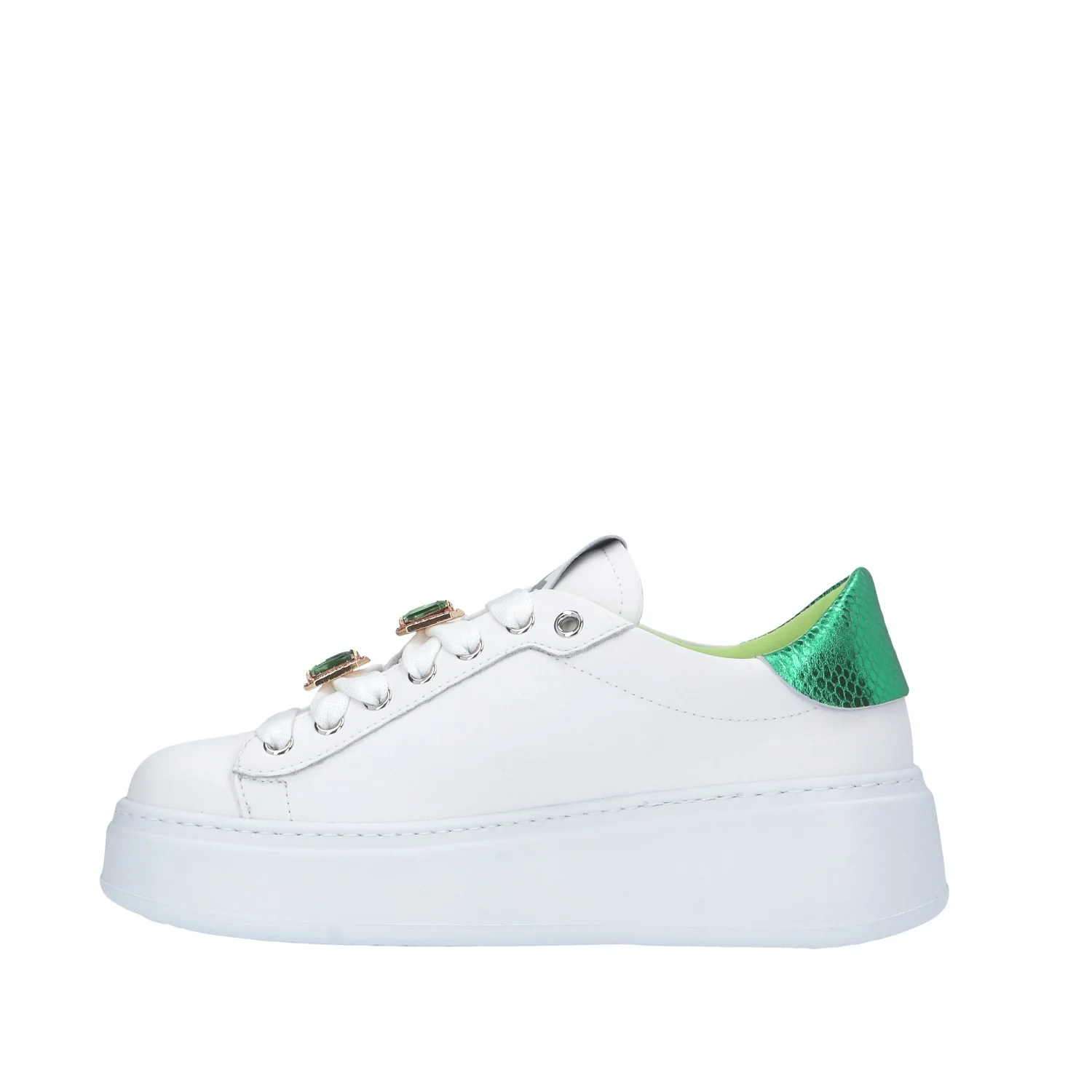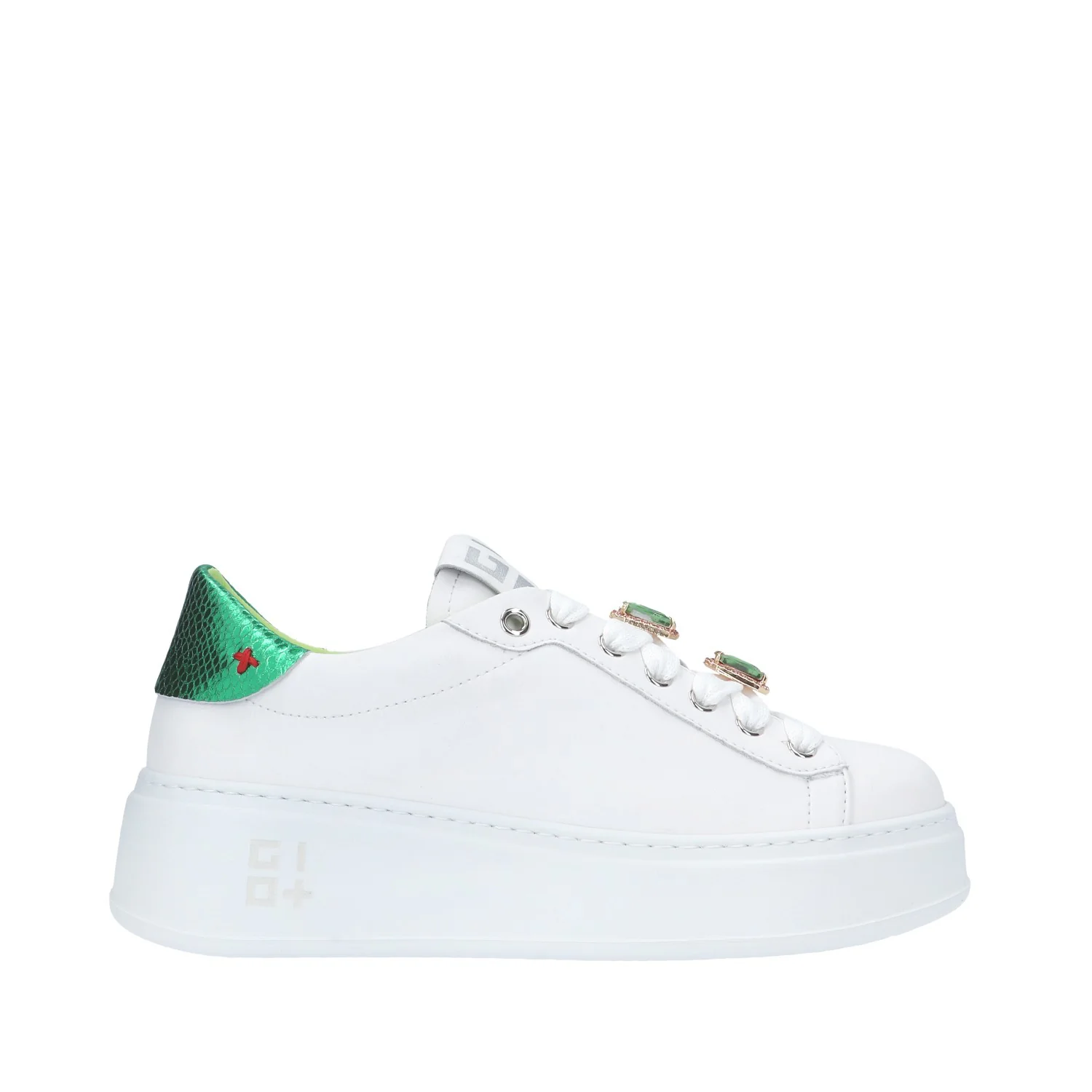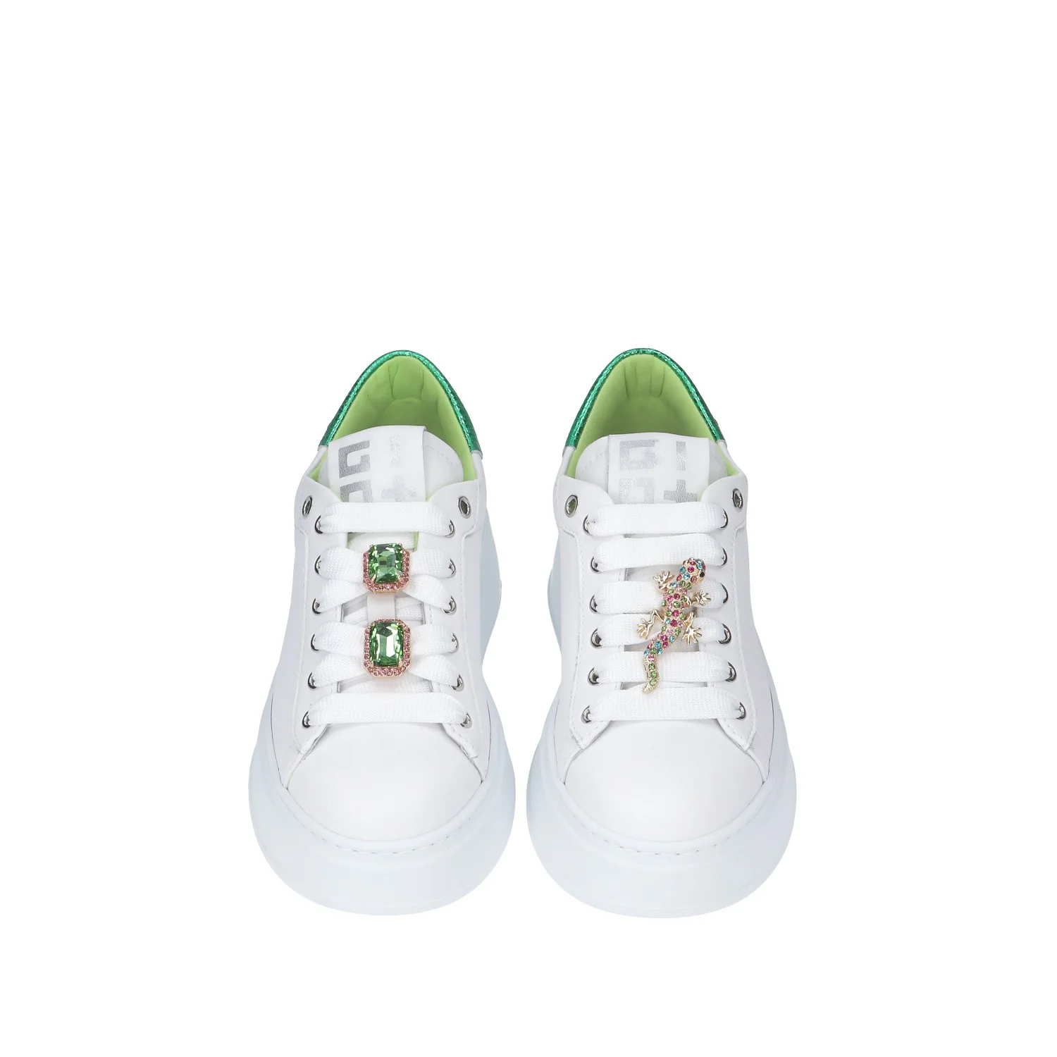 Modello: sneaker; Materiale tomaia: pelle; Colore: bianco con retrotallone verde effetto cocco; Interno: pelle, soletto removibile in pelle; Fondo: gomma 5 cm; Chiusura: lacci con applicazioni gioiello a forma di pietra verde e di geco dorato con strass multicolor; Calzata: regolare; Descrizione riferita al numero 37. Art.:PIA180C
