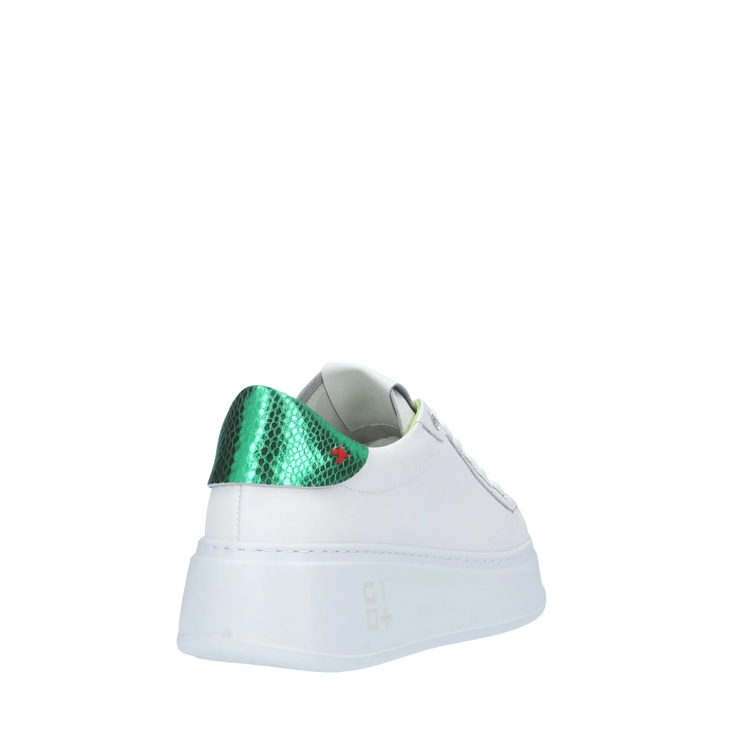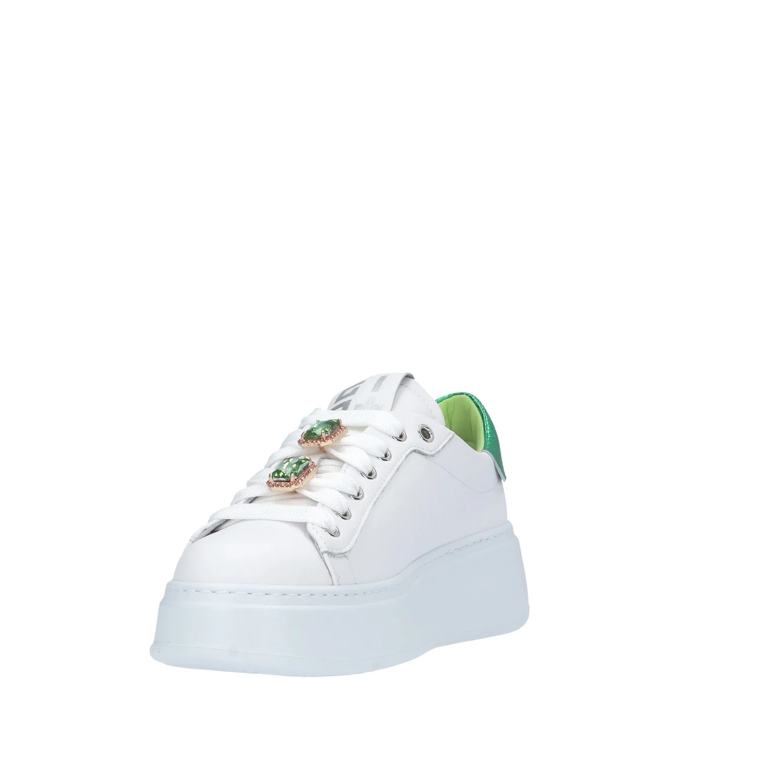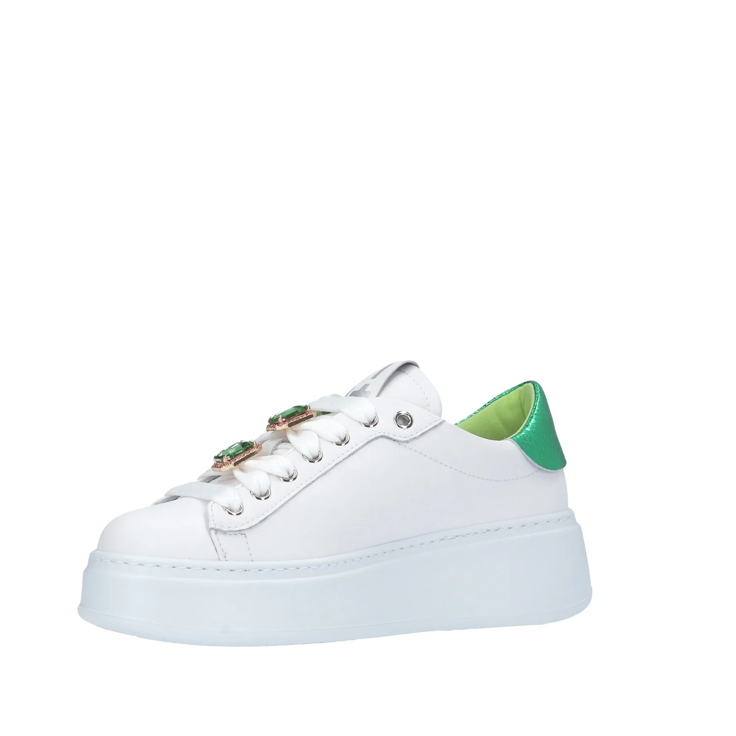 Modello: sneaker; Materiale tomaia: pelle; Colore: bianco con retrotallone verde effetto cocco; Interno: pelle, soletto removibile in pelle; Fondo: gomma 5 cm; Chiusura: lacci con applicazioni gioiello a forma di pietra verde e di geco dorato con strass multicolor; Calzata: regolare; Descrizione riferita al numero 37. Art.:PIA180C
