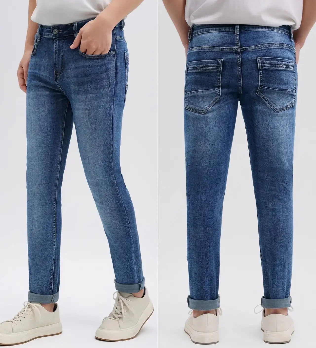 Jeans uomo blu elasticizzati in taglie 44-56, per ogni corporatura. Denim confortevole che unisce stile e libertร di movimento. Ideali per outfit versatili.
