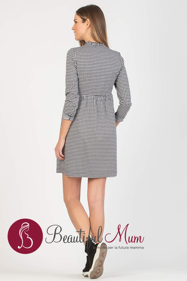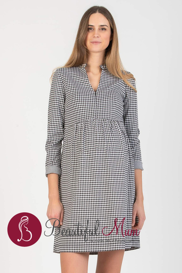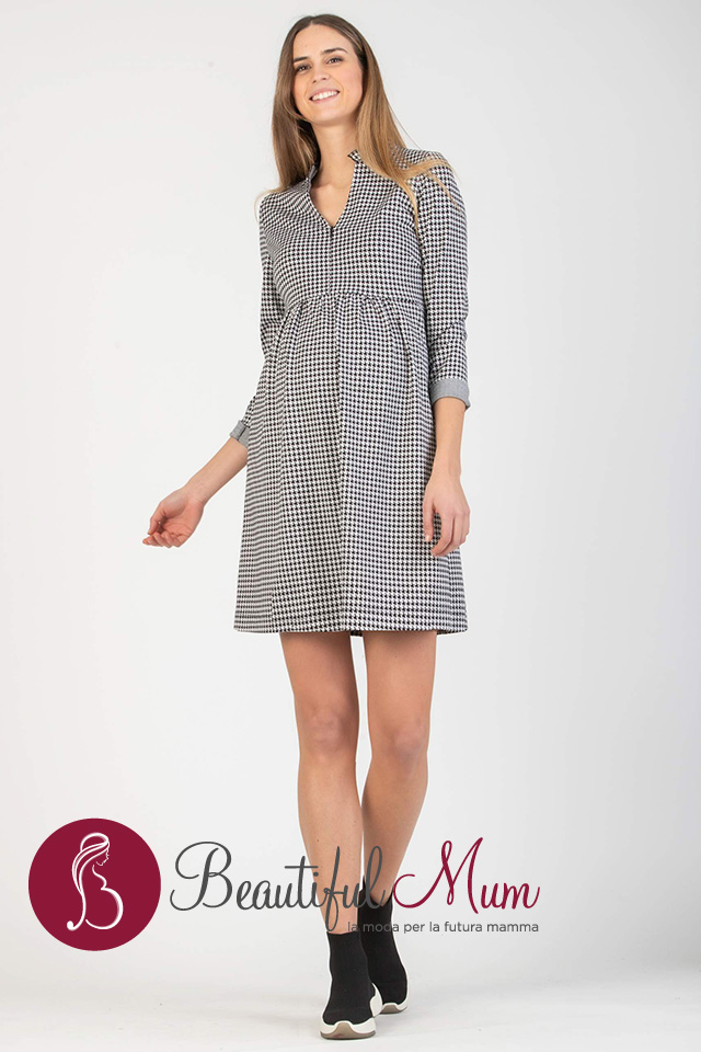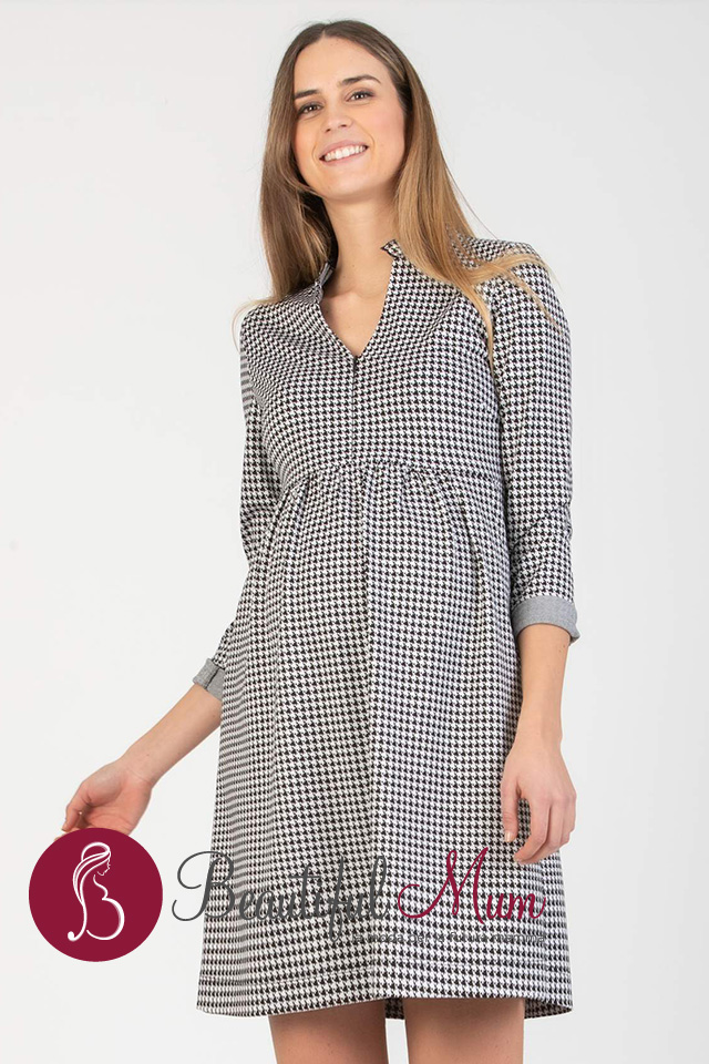 Abito premaman e allattamento in jacquard su stampa pied de poule con maniche lunghe, scollo a V e rouches sul girocollo. Una zip invisibile sul davanti consente di aprire lo scollo per allattare in modo pratico e comodo. La vita a stile impero con piccola arricciatura e il morbido tessuto permettono la naturale crescita della pancia senza mai stringere e lo rendono adatto ai diversi stadi della gravidanza e al periodo postparto.