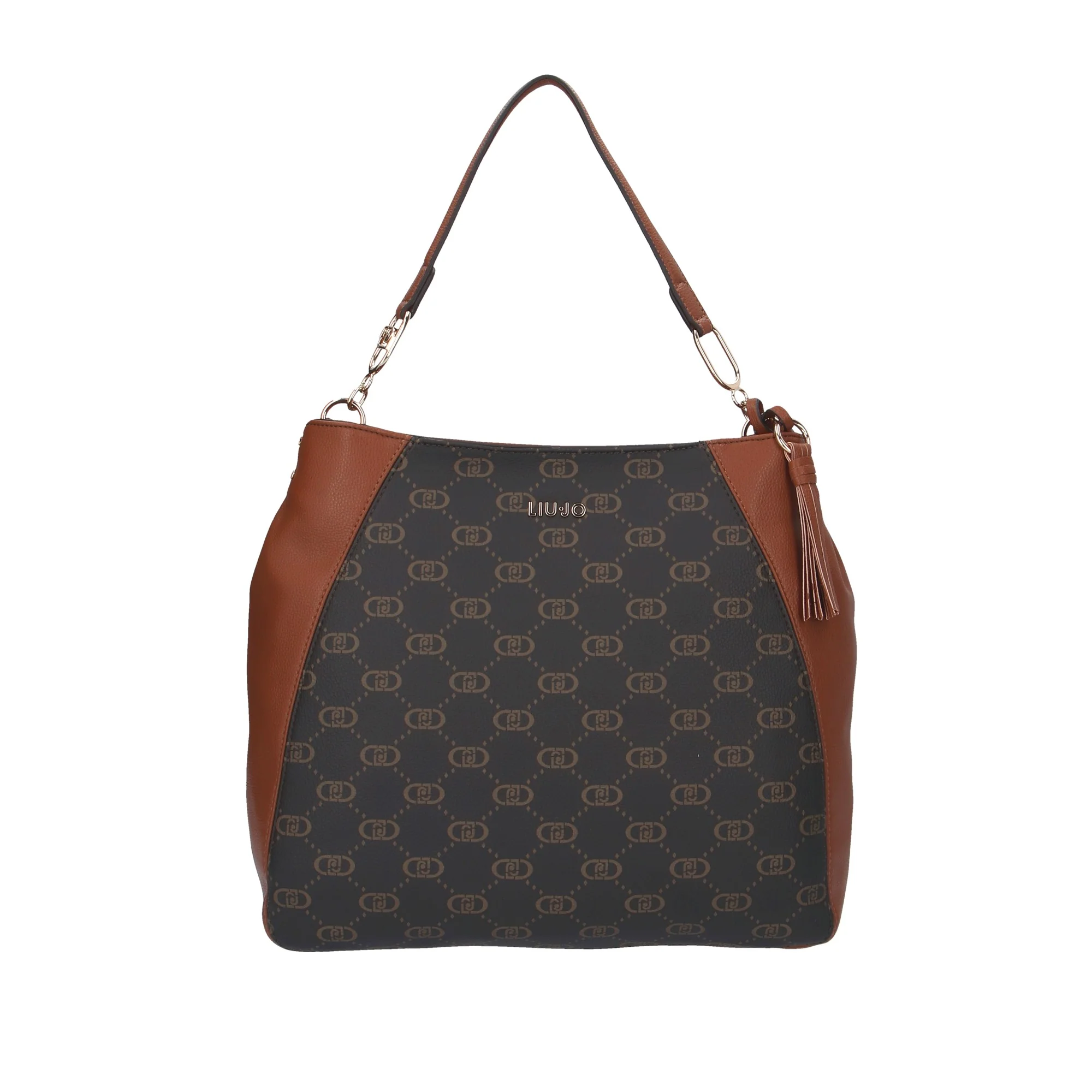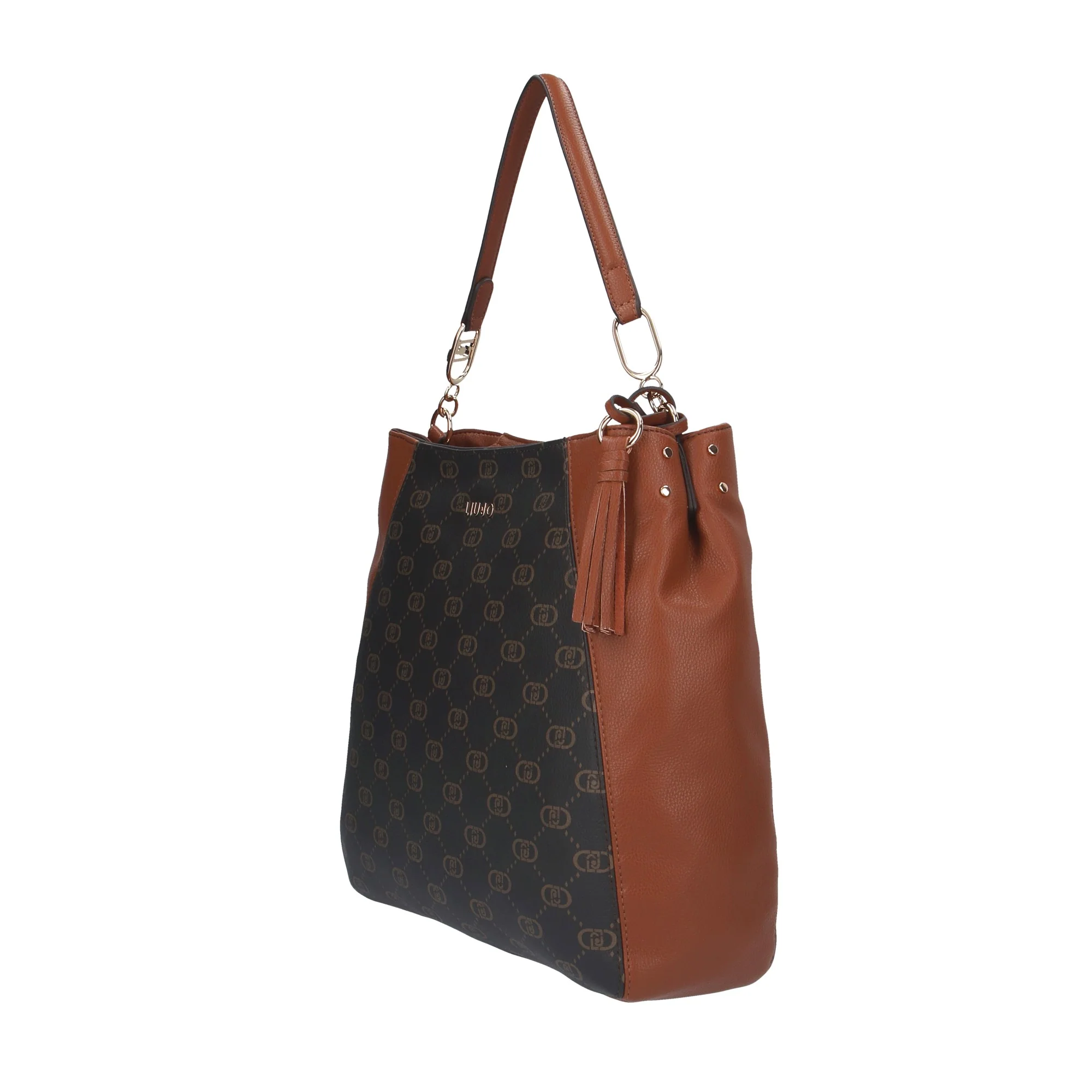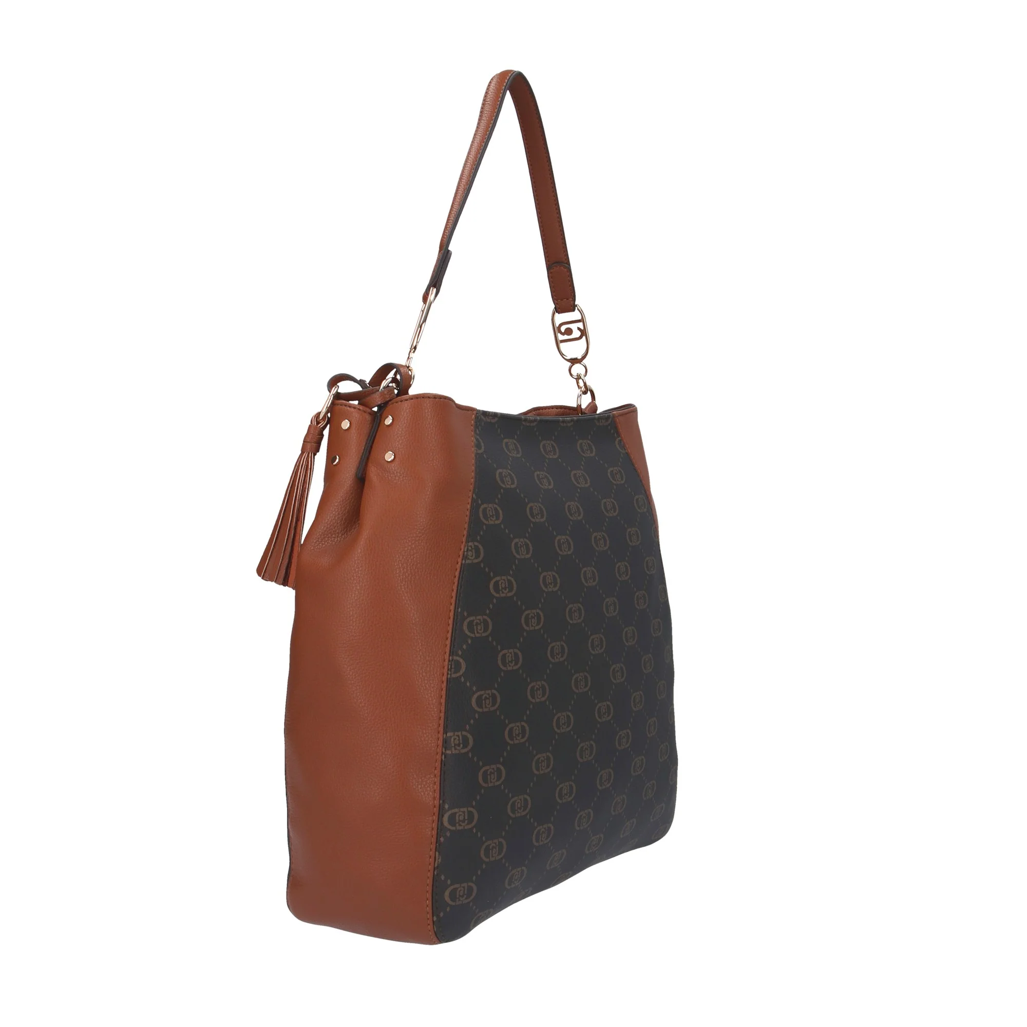 - Design Elegante: Motivo monogramma Liu Jo su sfondo scuro con dettagli in ecopelle marrone.