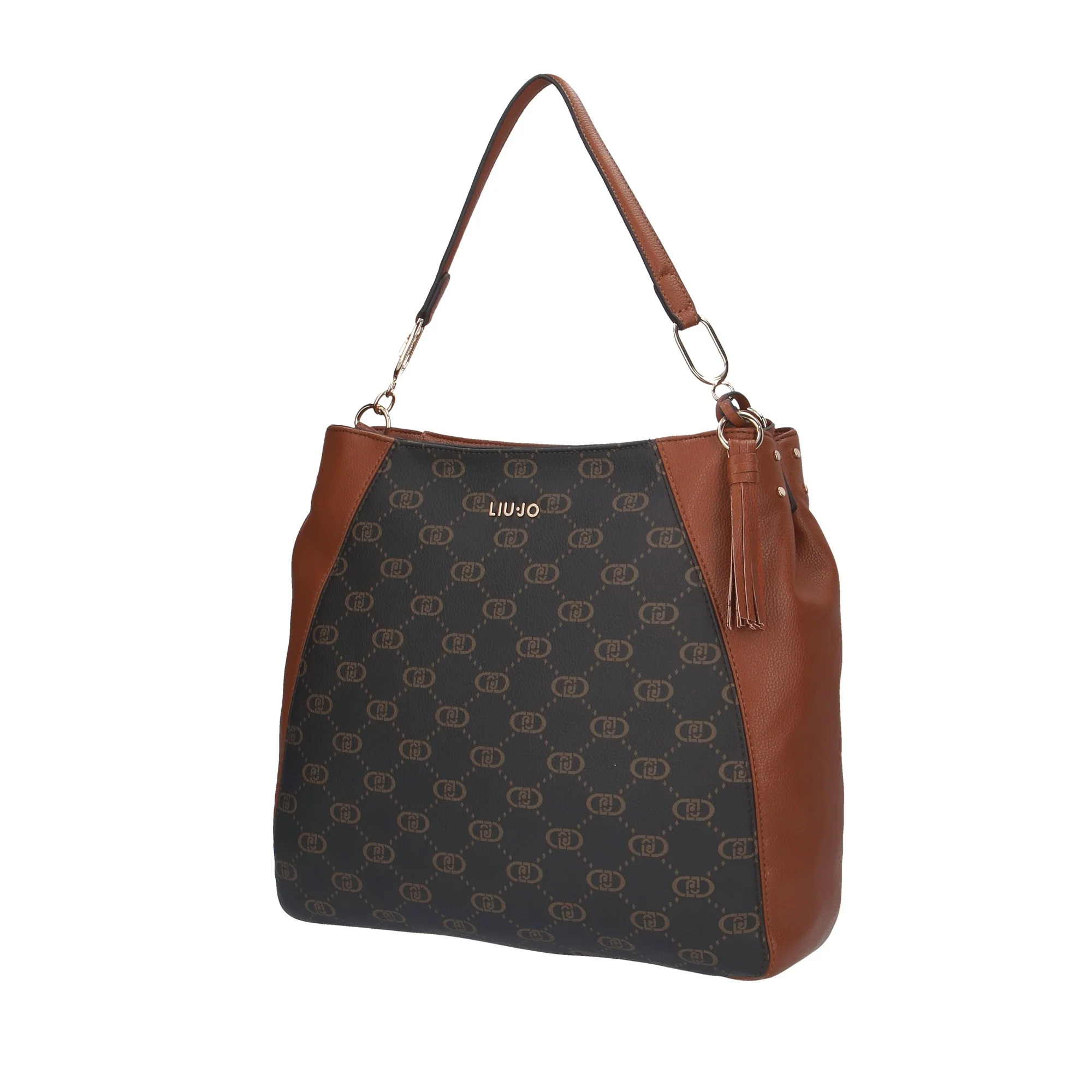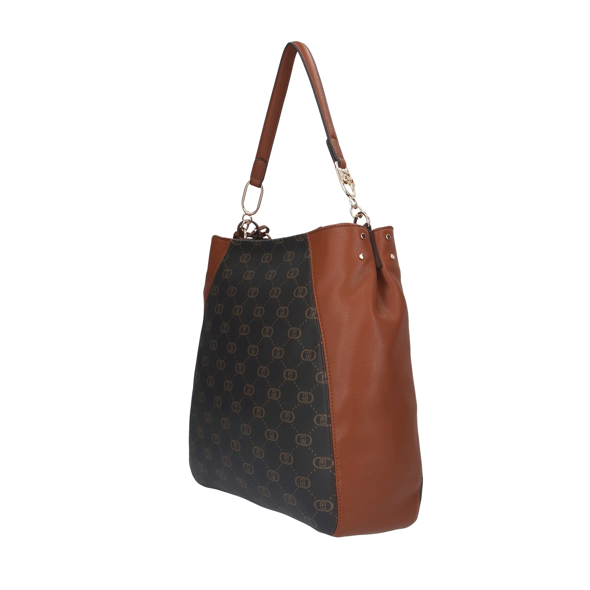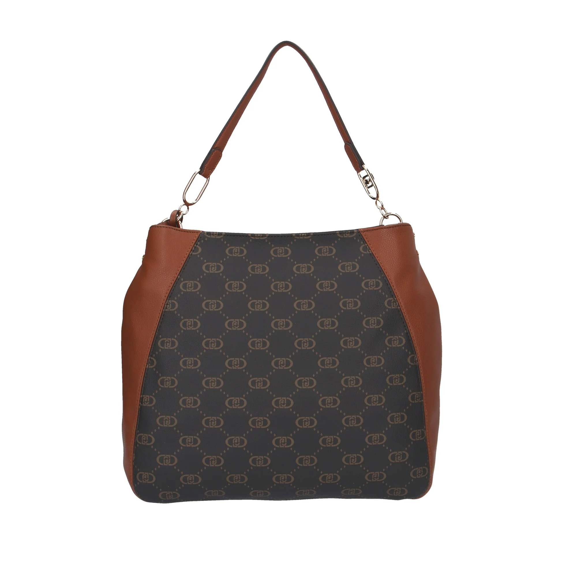 - Design Elegante: Motivo monogramma Liu Jo su sfondo scuro con dettagli in ecopelle marrone.