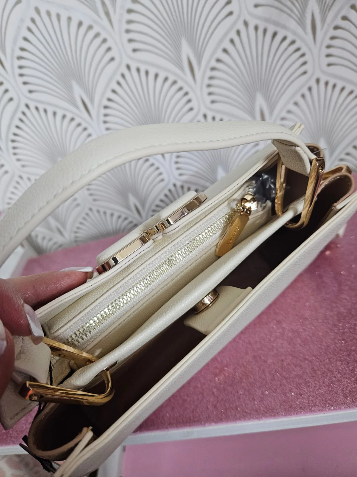 Scegli la borsa top handle in similpelle bottalata con logo in metallo rivestito e tracolla rimovibile. Per un tocco raffinato ai tuoi look. Tracolla regolabile e removibile lunghezza 120 cm. Misure 24x16x11 cm