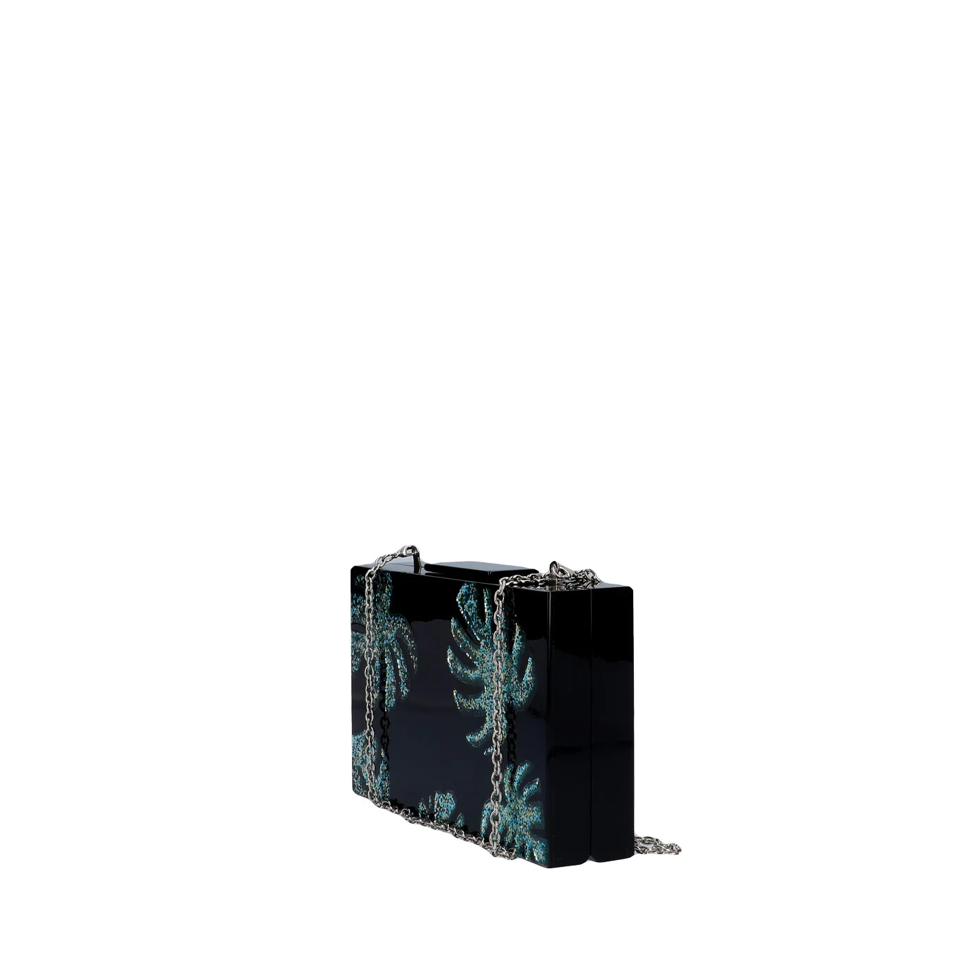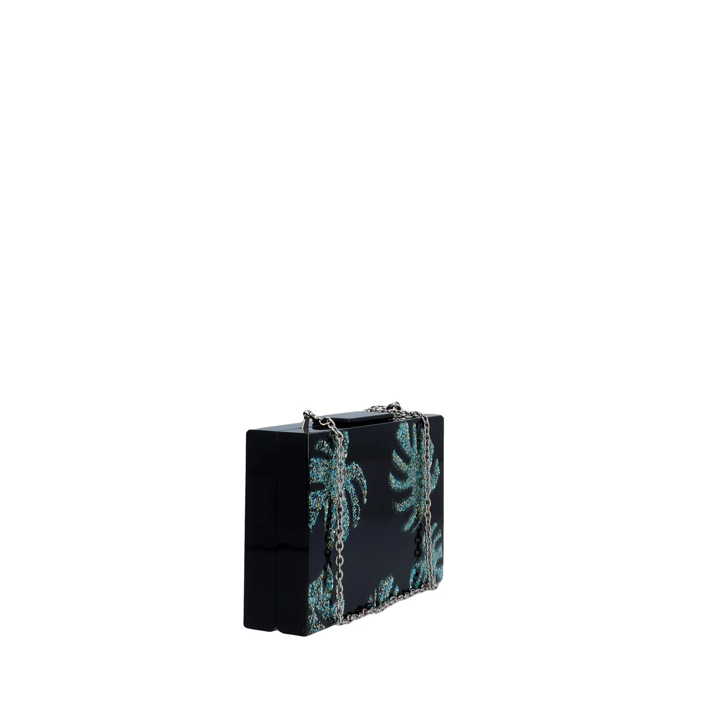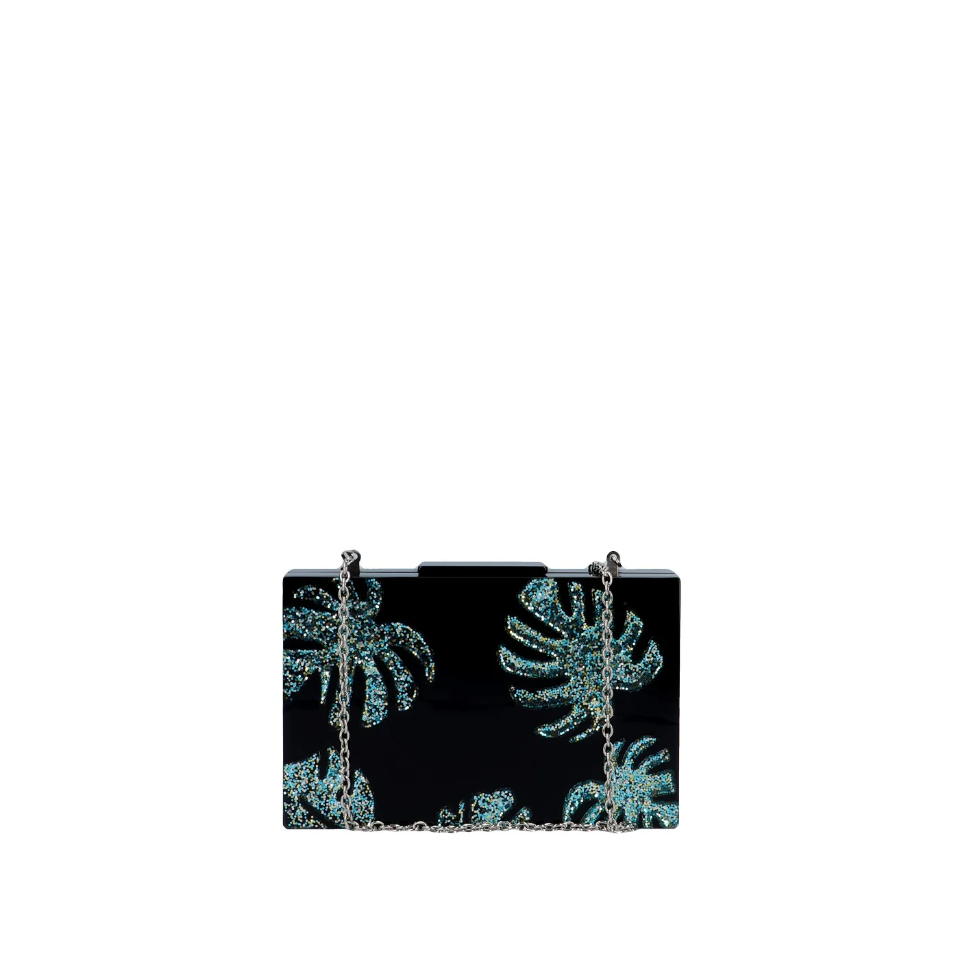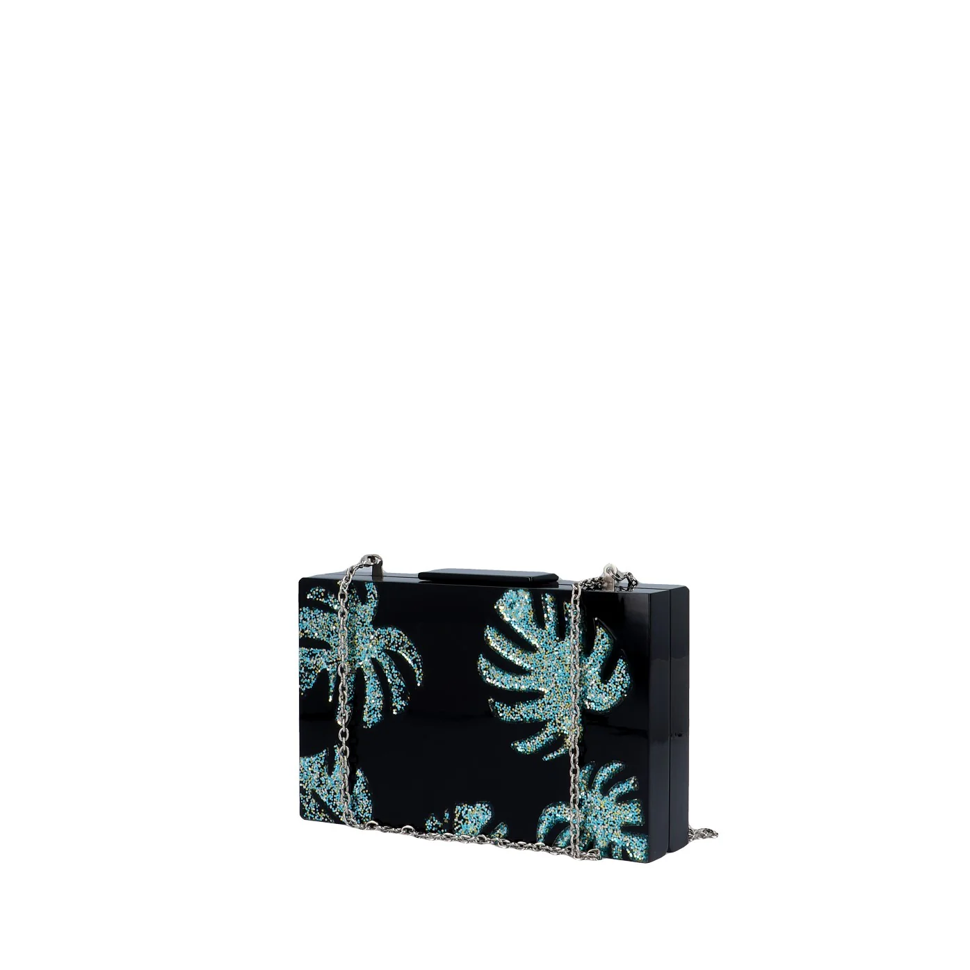 Una clutch dal carattere deciso in questa veste total black con decorazione in strass in varie gradazioni di blu.