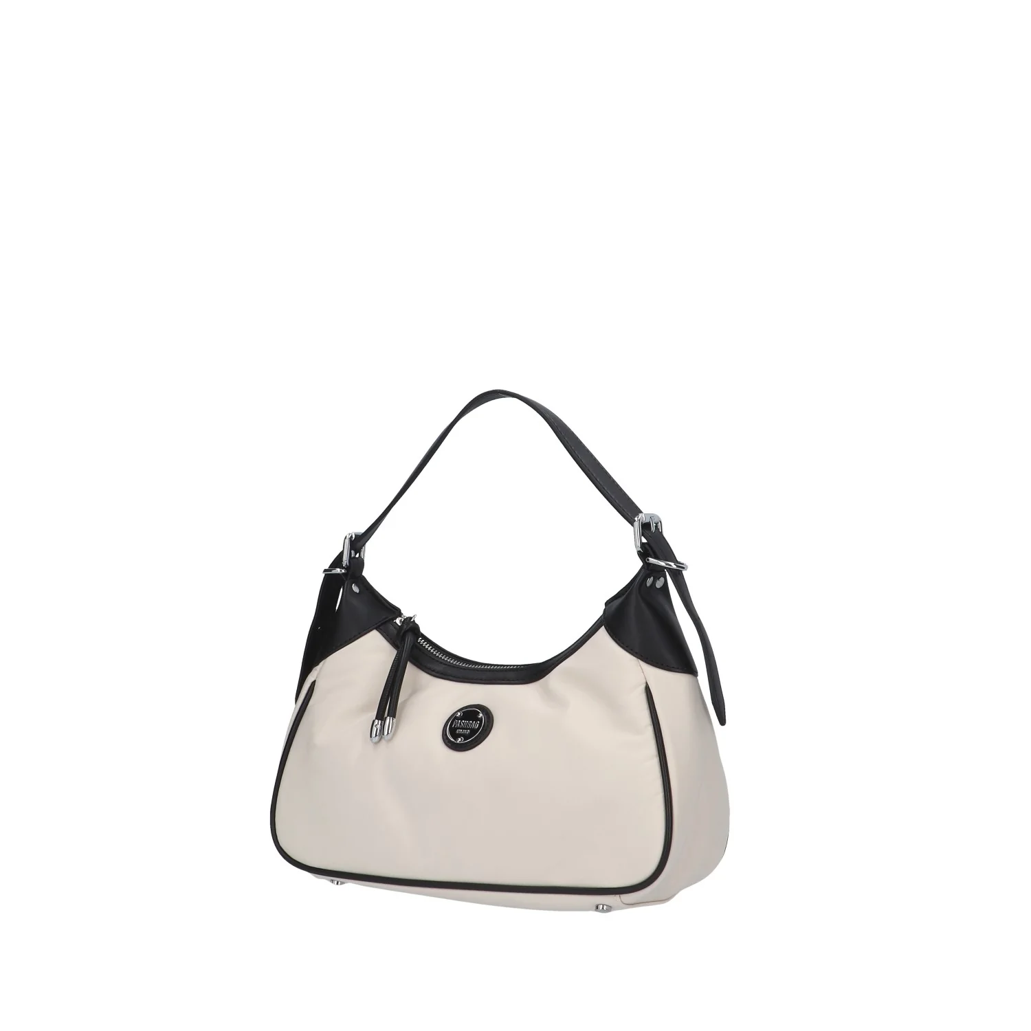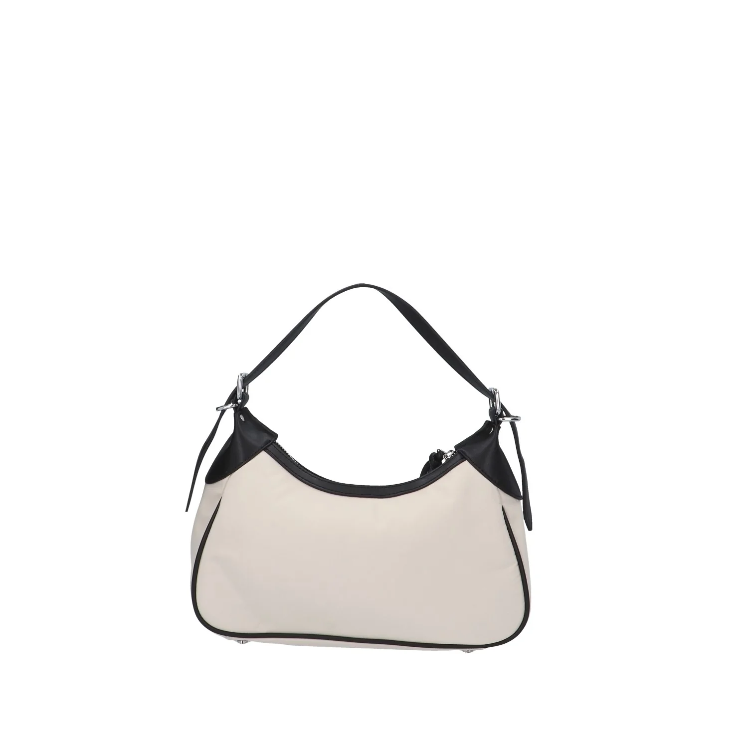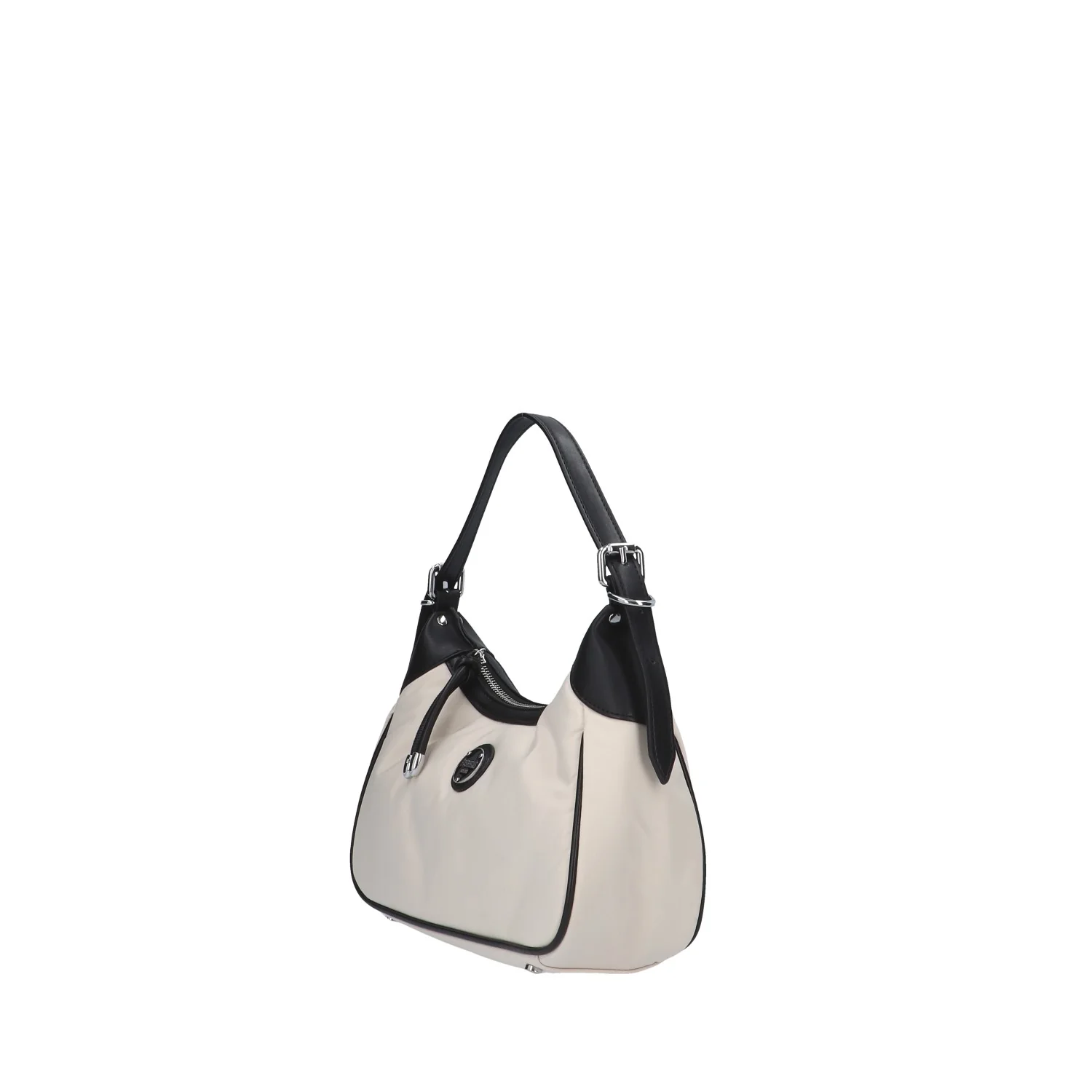 Modello: borsa a spalla; Materiale: tessuto/ecopelle; Colore: panna/nero; Interno: tessuto; Chiusura: zip; Dimensioni: 30x16x9 cm; Art.:ARIA