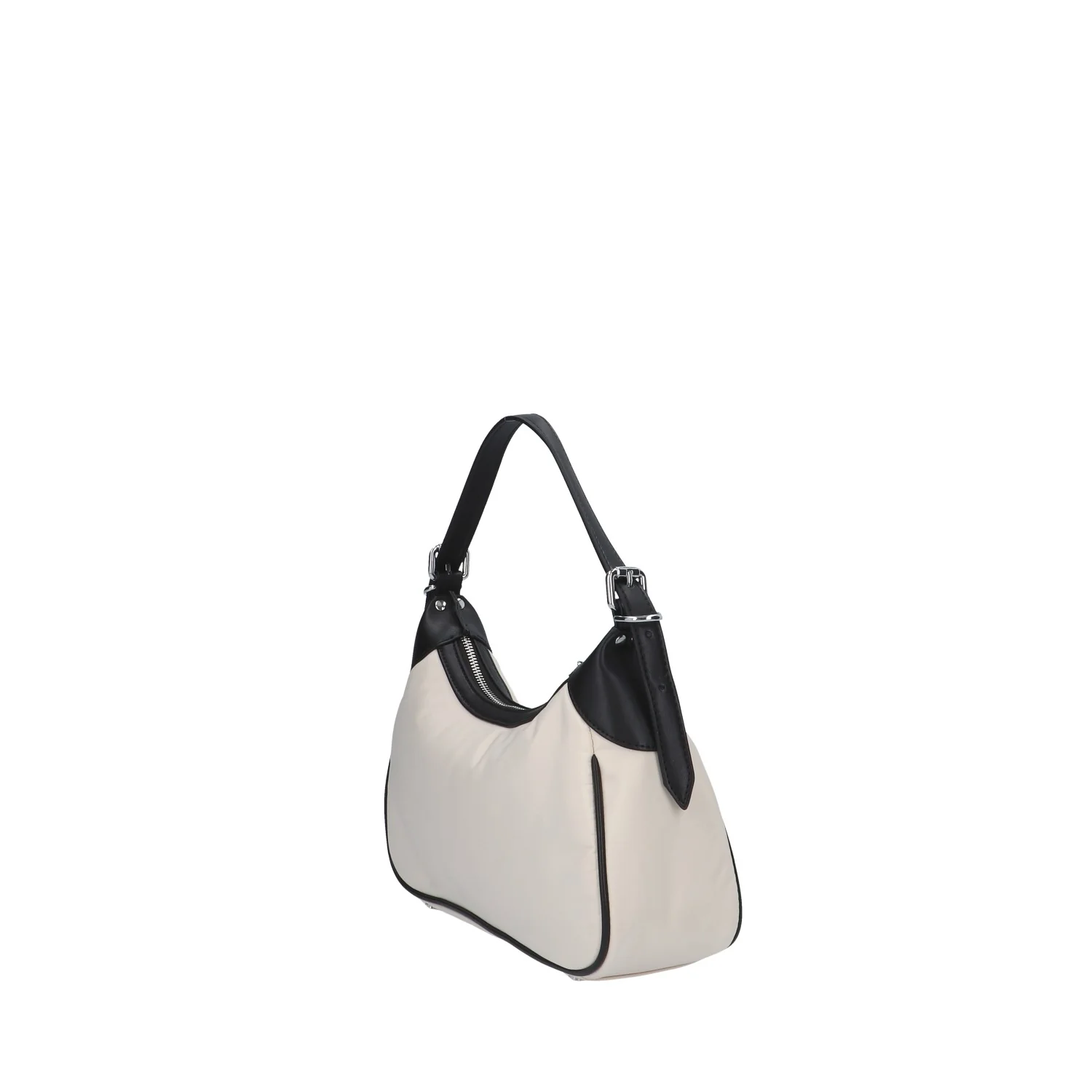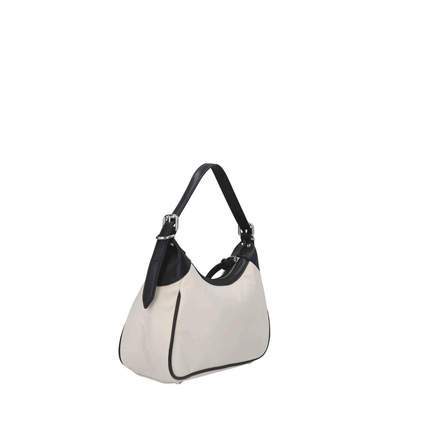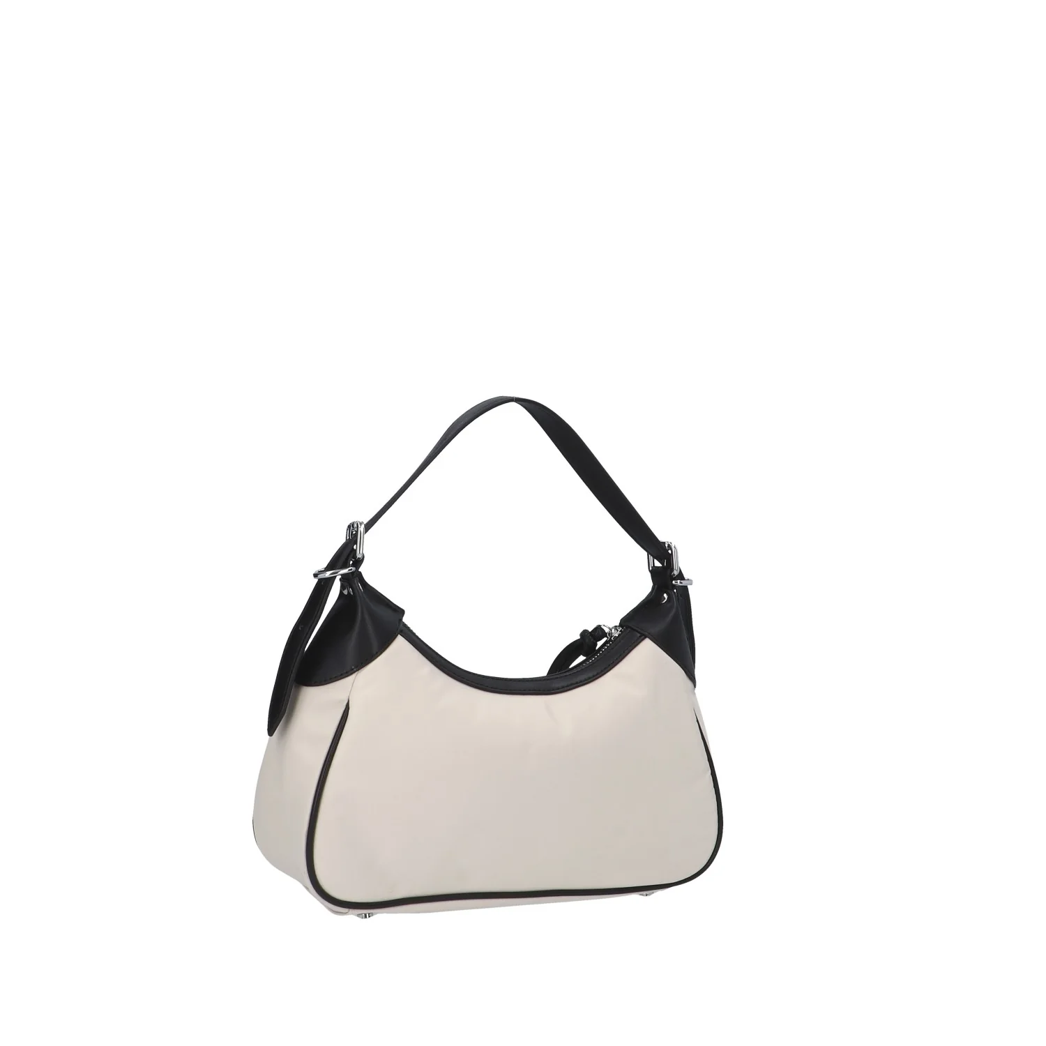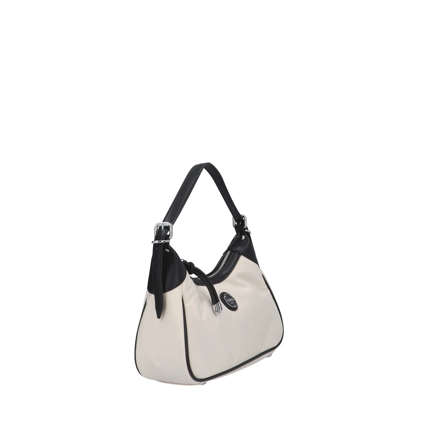 Modello: borsa a spalla; Materiale: tessuto/ecopelle; Colore: panna/nero; Interno: tessuto; Chiusura: zip; Dimensioni: 30x16x9 cm; Art.:ARIA