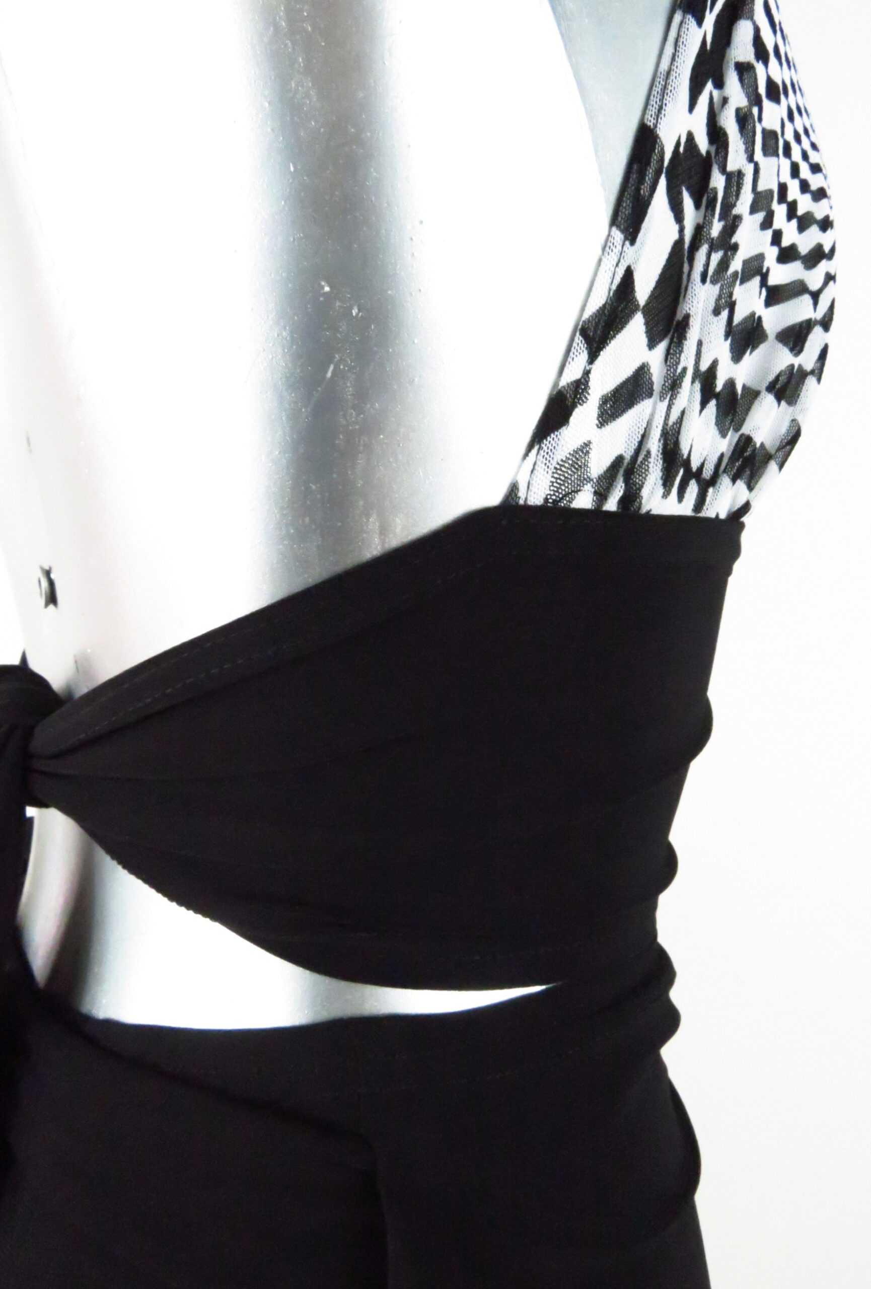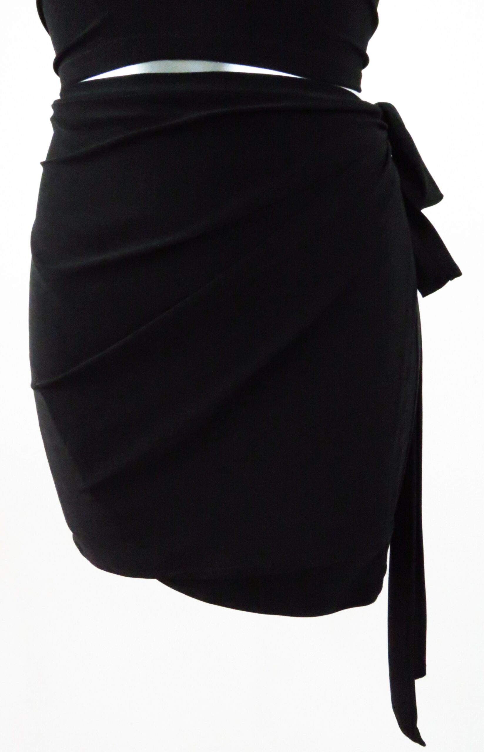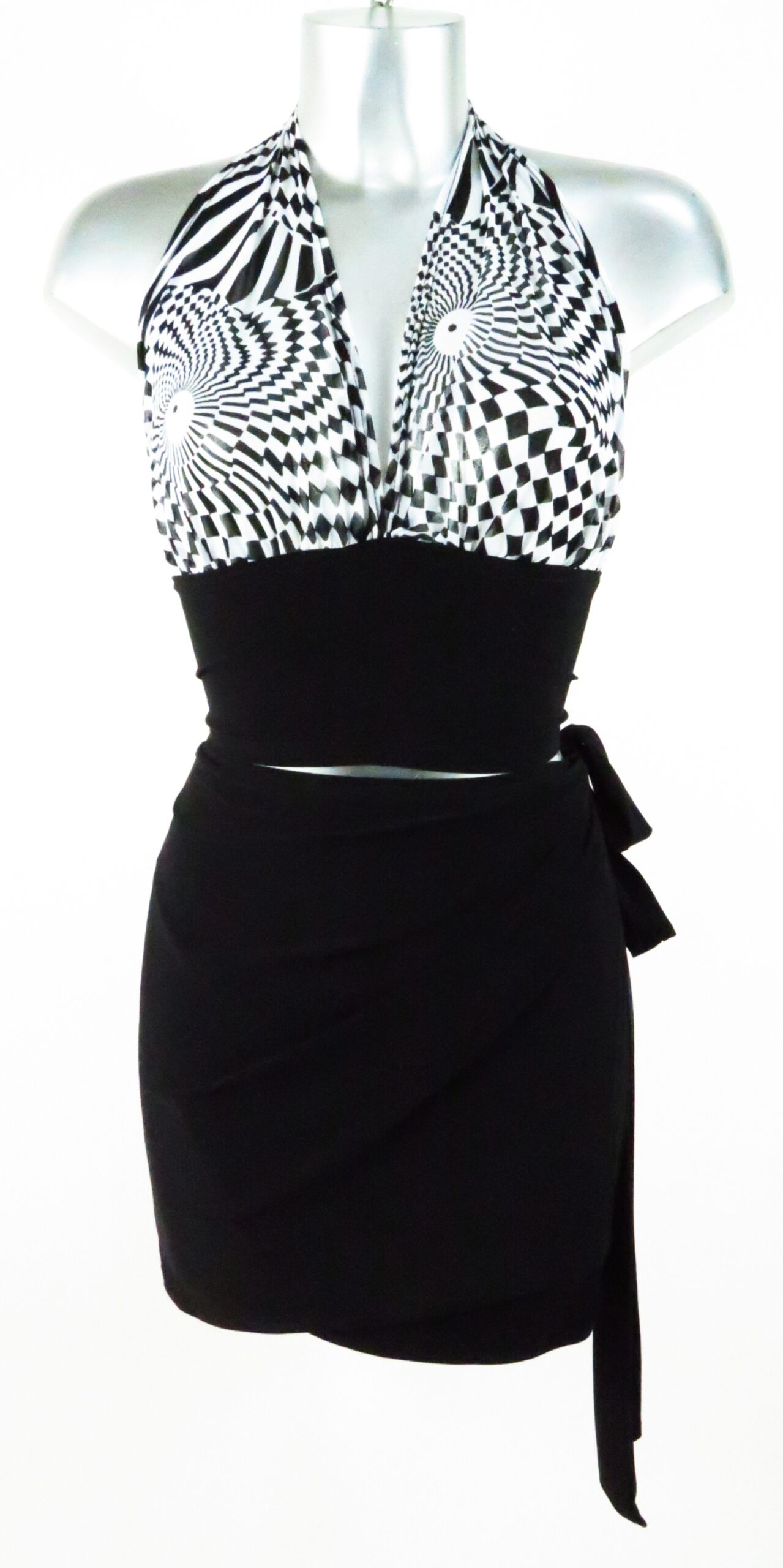 Bellissimo completo estivo composto da due pezzi. Gonna pareo corta da legare di lato in morbida viscosa elasticizzata. Top coppe Marilyn in tulle optical da legare al collo con fascia sotto seno in viscosa da legare sulla schiena.