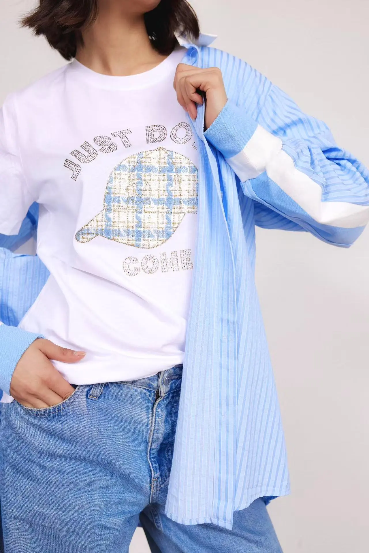 Si tratta di una maglietta bianca a maniche corte con la scritta “JUST DO IT COME” stampata sopra e un motivo scozzese in stile cappellino da baseball al centro. Semplice ma alla moda, con uno stile casual, รจ adatto per l’uso quotidiano. Sia abbinato a pantaloni casual o pantaloncini, puรฒ mostrare uno stile casual e comodo.