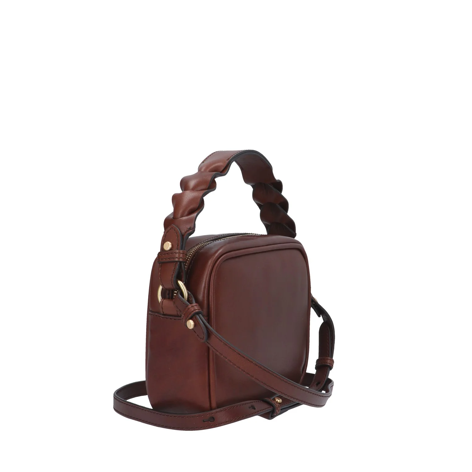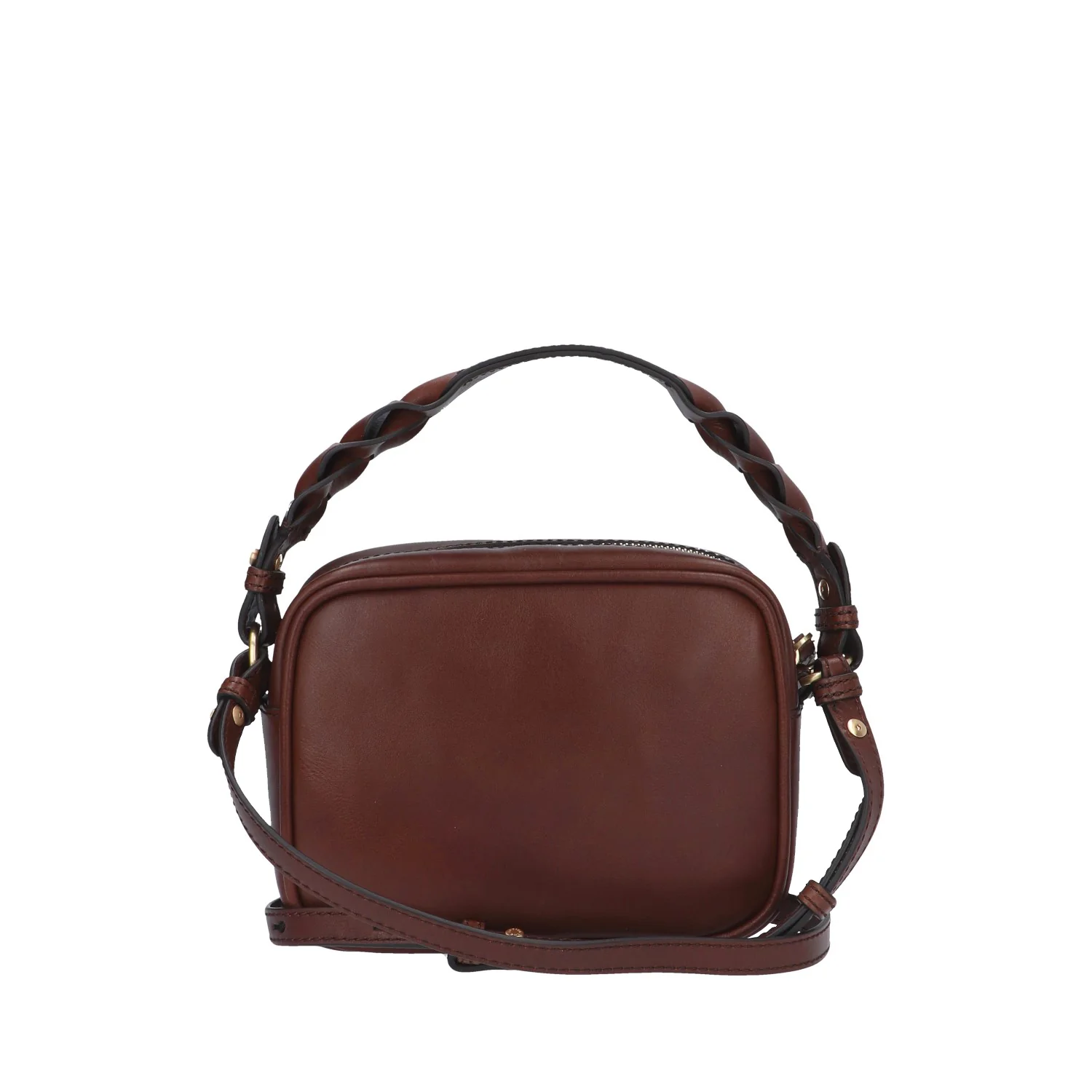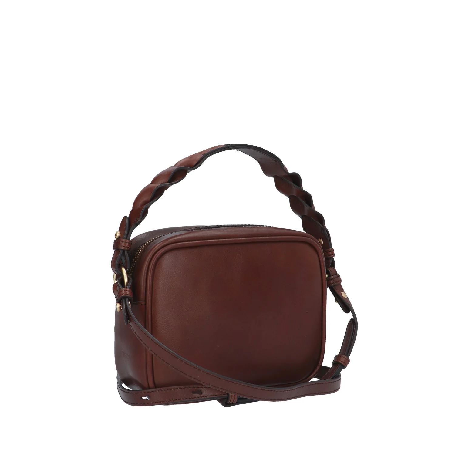 Modello: borsa a mano/tracolla; Materiale: pelle; Colore: marrone; Interno: tessuto; Dettagli: 2 taschini (1 con zip) e tracolla; Chiusura: zip; Dimensioni: 21x16x7 cm; Art.:0449047J