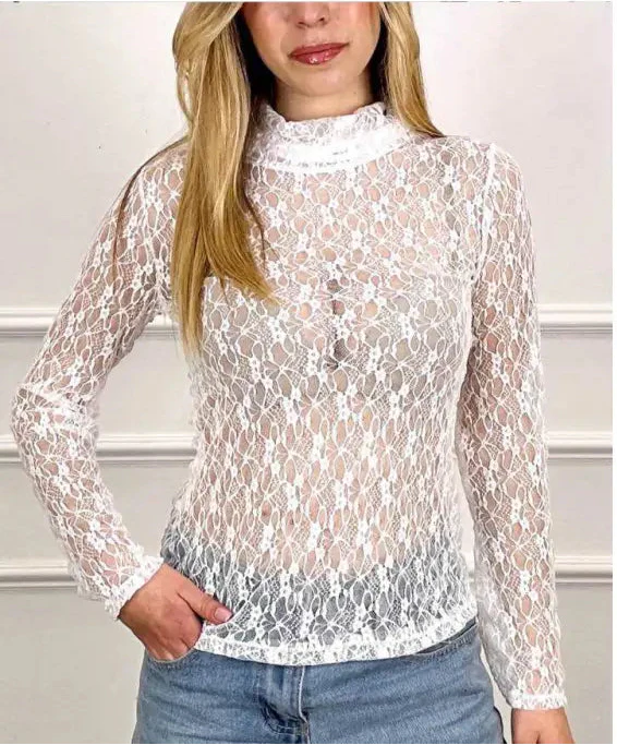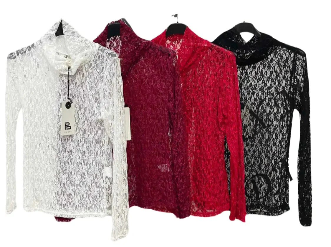 Esalta la tua femminilitร con questo top in pizzo trasparente, un capo sensuale e raffinato che aggiunge un tocco di eleganza a ogni look. Realizzato in pizzo di alta qualitร , presenta un design trasparente e un collo alto per un effetto sofisticato. Disponibile in quattro coloriโbianco, rosso scuro, rosso vivo e neroโรจ ideale per serate speciali o occasioni glamour.