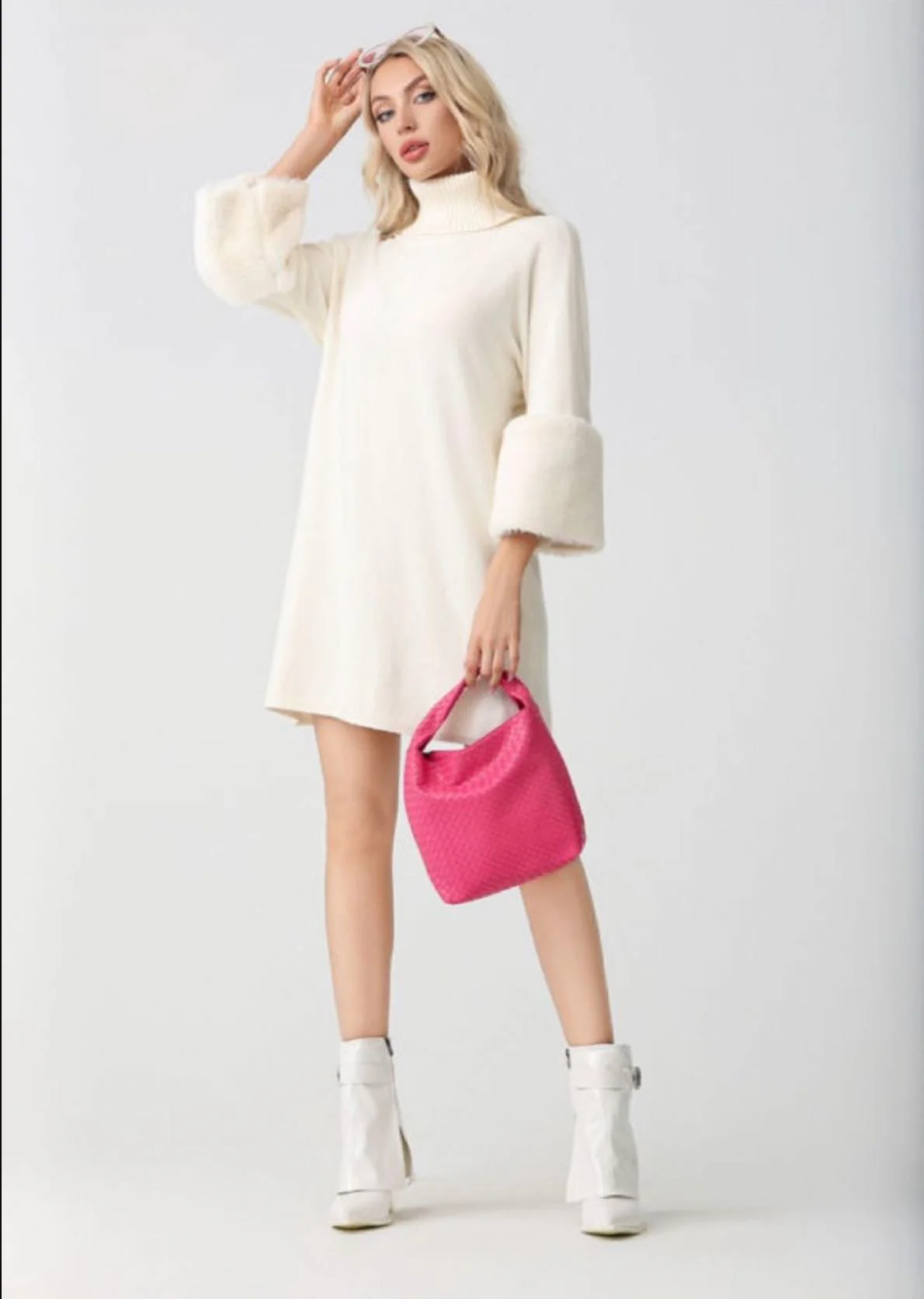 Vestito a collo alto Pelliccia sulle maniche 50% viscosa 28% poliestere 22% poliammide Le foto sono tutte scattate in negozio. Potrebbe esserci differenza di colore.