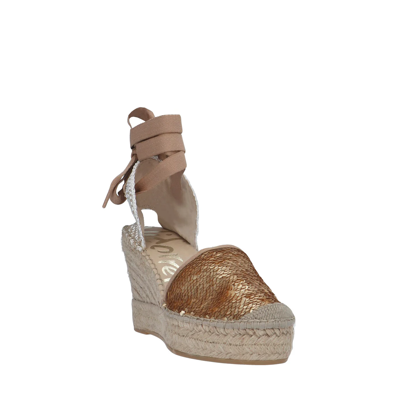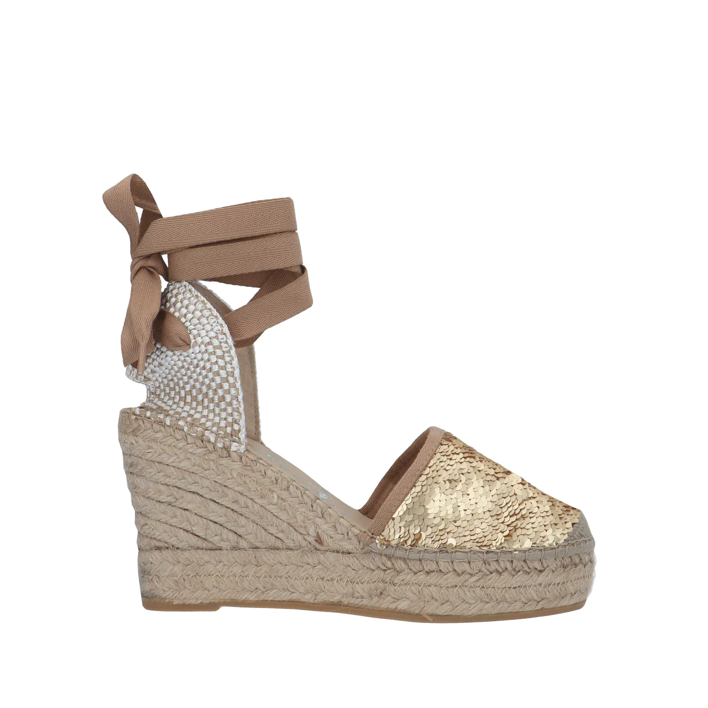 Modello: espadrillas;Materiale tomaia: paillettes;Colore: oro;Interno: tessuto;Fondo: zeppa in corda 9,5 cm;Chiusura: lacci in tessuto;Calzata: regolare;Descrizione riferita al numero 37.Art.:06700