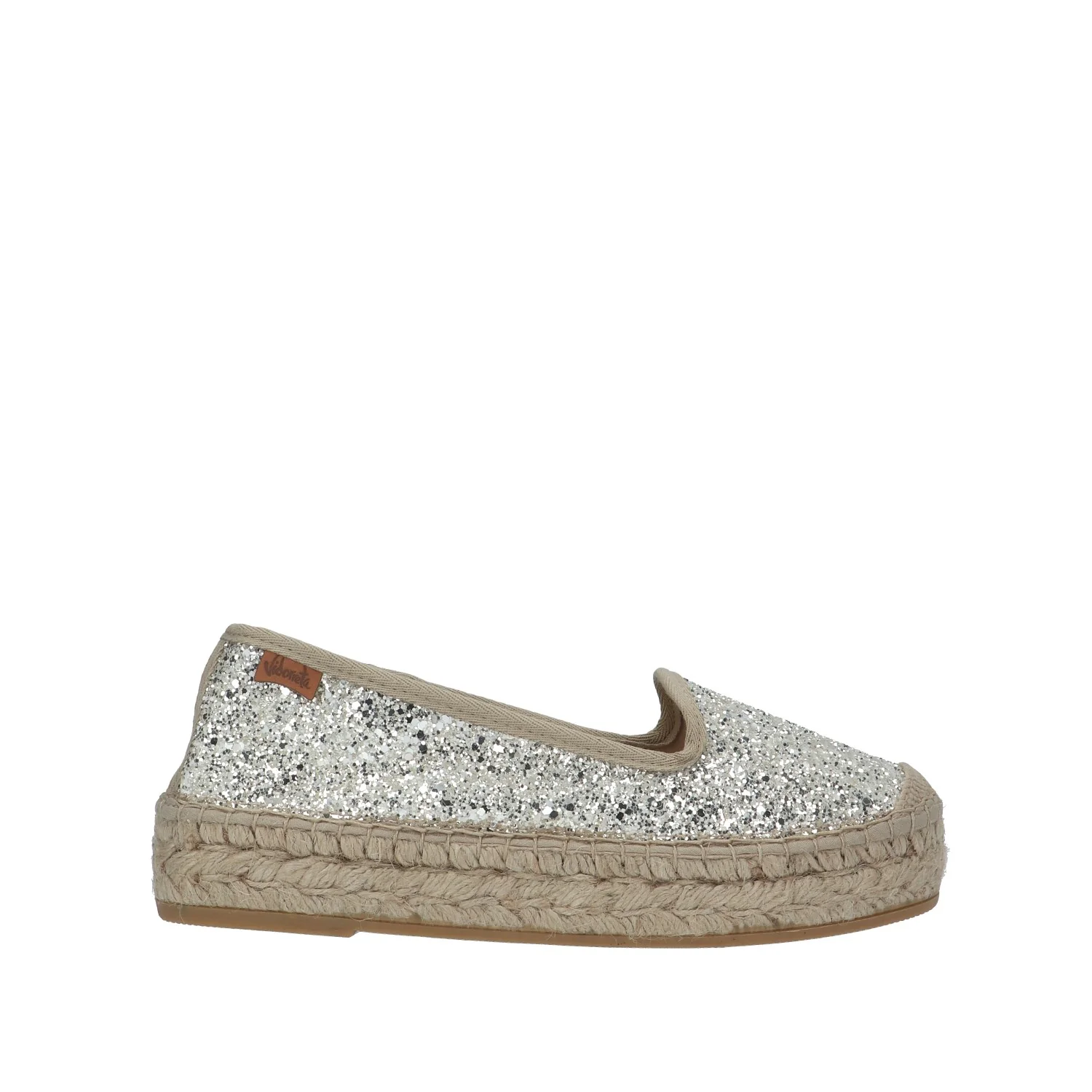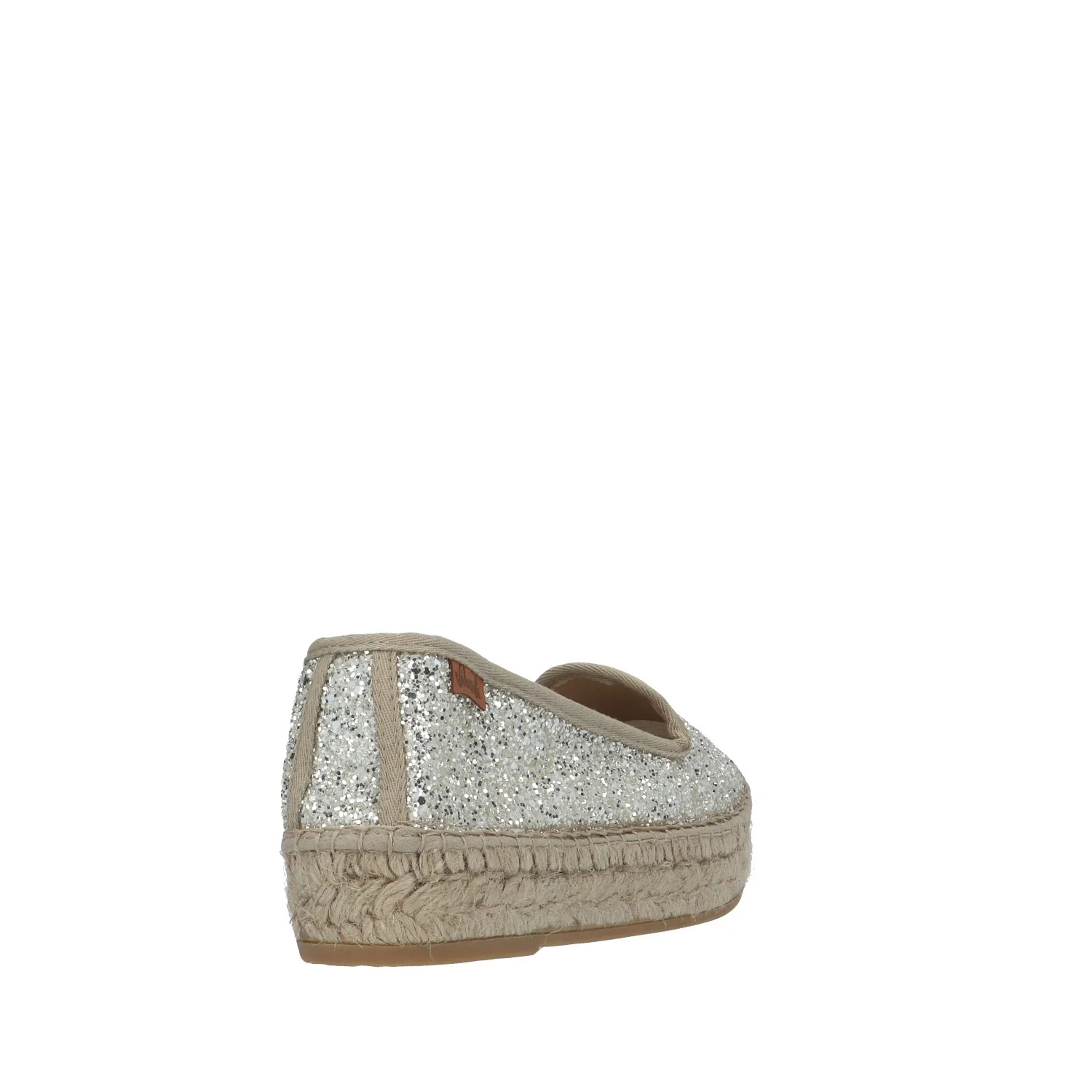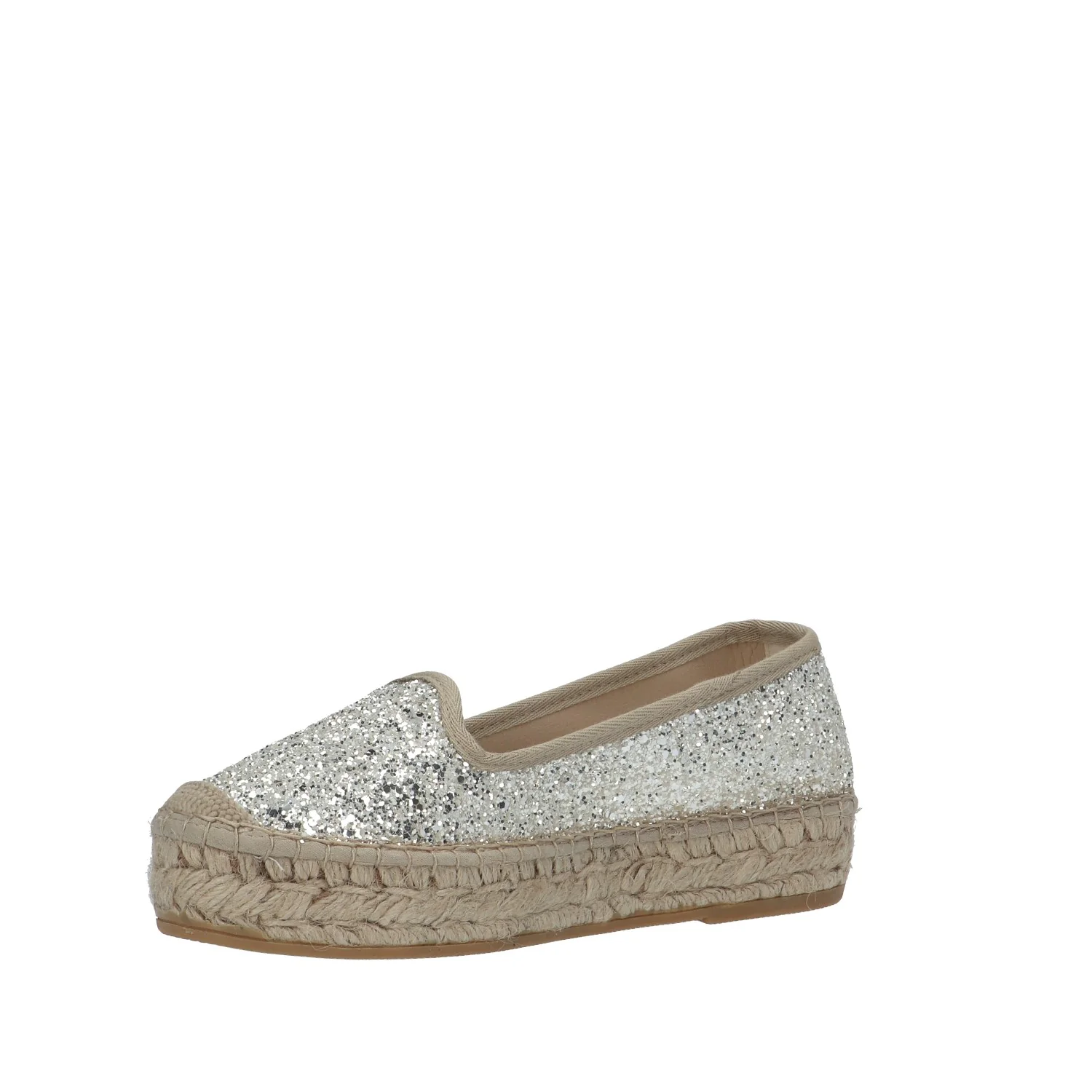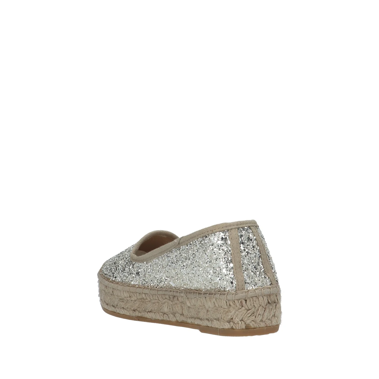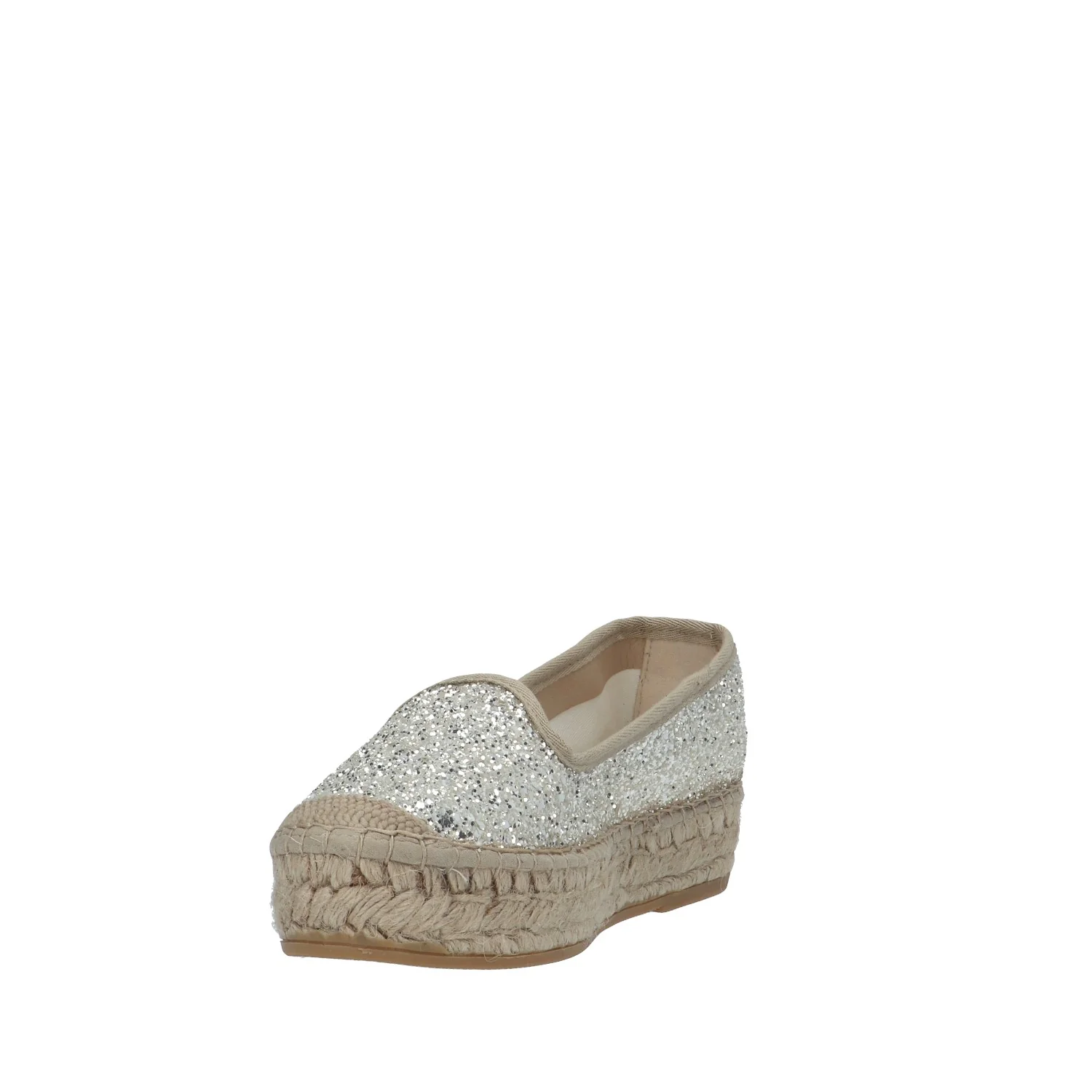Modello: slip on; Materiale tomaia: glitter; Colore: ghiaccio; Interno: tessuto; Fondo: platform in corda 3 cm; Chiusura: no; Calzata: regolare; Descrizione riferita al numero 37. Art.:74500
