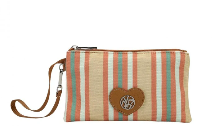 Pochette ynot? linea Stripes, collezione PE25. chiusura con zip polsiera removibile interno organizzato e foderato realizzato in tessuto ed ecopelle L 20,00 x P 1,50 x H 12,00